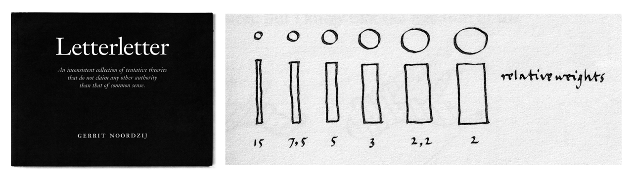 Quand vient le sujet de la graisse des caractères, le maître pointe le non-sens des appellations usuelles (“bold”, “light”, “regular”…), dépourvues de relation aux proportions réelles des signes et hors de tout cadre normatif. Noordzij se positionne alors en faveur d’une échelle basée sur le ratio hauteur/largeur des fûts des bas-de-casse.