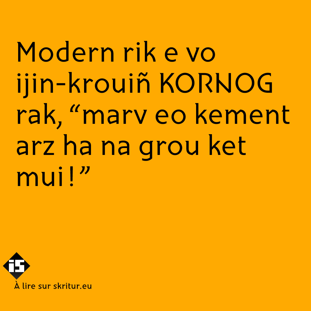 GANET EO KORNOG! KORNOG ! Arm nevez ha goveliet mat : “AR SEIZ BREUR”, ha mistri al lennegezh hag an arzoù breizhat a plijo d’an holl hag a raio berzh, evit servij preder yaouank breizhat. Goude ur prantad a bloavezhioù a zifraosterezh hir ha diaes, goude stourmoù start, AR SEIZ BREUR, evit ledanañ e vruderezh evit adganidigezh hon arz broadel, a grou hiriv ar gelaouenn-mañ hirc’hortozet e bed arzel hor bro. Petra a fell da GORNOG ober ? Adsevel e Breizh un oaled arzel, ken kreñv, ken bev, ken “E-Unan” hag hini a gemere perzh evit sevel penn-oberennoù a zo un tamm peplec’h war hon tachennad : ilizoù, ostelloù, kalvarioù, chapelioù e kerioù ha war ar maez. C’hoant ‘n eus KORNOG adreiñ da Vreizh fun dibab a livourien, a gizellerien, a ginklourien, a disavourien, a benerien skeudennoù, a sonerien, a artizaned, re a vank dezhi abaoe daou c’hant bloaz, hag e oa e vrasted gwechall. C’hoant en deus KORNOG en ur vrudañ anezho, o wareziñ anezho, adsevel buhez an arz koueriad, an arz poblek, diazezoù pep arz broadel. C’hoant ‘n eus KORNOG lakaat an arzourien yaouank breizhat e-barzh luskad an eskemmoù menozioù etrevroadel en ur zistrujañ ar voger a stank ar sell war maez a zo anvet Pariz hag al levezon spered, hag lakaat anezho da anavezout arz ar pobloù all hep tremen dre sil dousaet Pariz. KORNOG a zo e bal, diskuliañ d'an dud arz Breizh da zont, her reiñ da gompren, da garout ha da souten. Modern rik e vo ijin-krouiñ KORNOG rak, ''marv eo kement arz ha na grou ket mui !''. KORNOG a raio da arzourien yaouank ha muzisianed Breizh, dizoleiñ hêrezh arzoù kozh a Iwerzhon hag a Vreizh. Bez e vo al liamm etre ar Gelted. KORNOG a zegemer ha degas ar varnadenn da gement eneber a zo, ha niverus e vint. N’eo ket KORNOG emsaver a strollad-mañ strollad, na kennebeut all ur sektenn. Frank eo KORNOG, digabestr evel avel vras ar C’hornog, evel e varnadenn, hag e vrutelladenn. KORNOG a lavaro ar pezh a soñj dezhañ. Breizh a zo o tihuniñ. Ar“Vamm-gozh” gant e chañsonioù a glemmicherezh, oc’h embann ar marv abaoe pell, a zo oc’h aadon d’ar vuhez. Ar vuhez-se a vo bevet e meur a-zoare, ha c’hoant en deus KORNOG da roiñ dezhi ar brasañ plijadur kinklañ gant murlivadurioù bras, tonioù fresk ganto ha joayus yaouank, e demeurañs nevez.