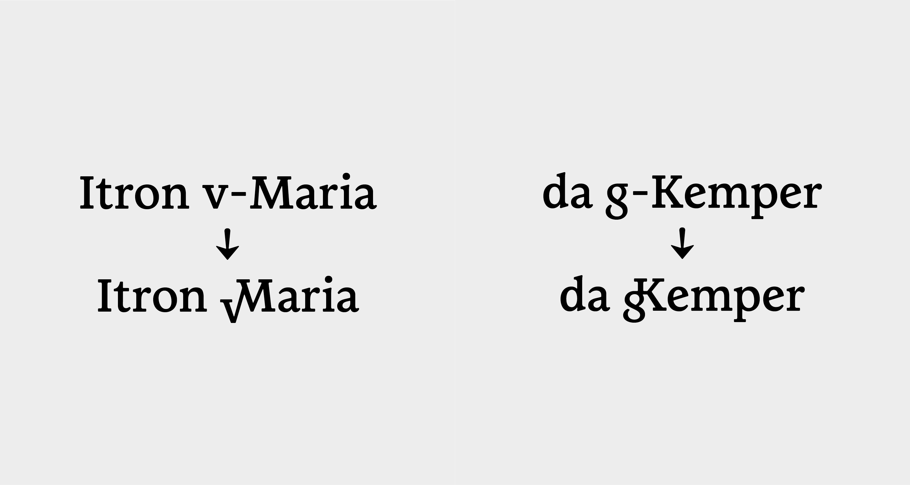 Dans ce cadre, l’intégration des mutations consonantiques (La mutation consonantique est une modification phonétique qui voit la consonne d'un mot changer selon son environnement morphologique ou syntaxique.) dans une logique proche de la ligature inclusive ouvre un champ expérimental nouveau. Ces mutations, éléments centraux de la grammaire bretonne, traduisent une souplesse linguistique que le design typographique peut mettre en valeur. Depuis des années, dans l’édition bretonne, le problème de la mutation consonantique des noms propres était traité au moyen de tirets ou de slashs. (exemple: v-Maria, v/Maria, ou alors simplement vMaria) La proposition d’une ligature fondue vient fluidifier la rédaction et apporter un élément supplémentaire dans le choix de la composition. En rendant visibles ces variations à travers des dispositifs graphiques, il devient possible d’articuler apprentissage, esthétique et inclusion. Cette approche fait du breton une langue vivante, malléable, capable de dialoguer avec les enjeux contemporains et de s’exprimer pleinement à travers la création typographique.