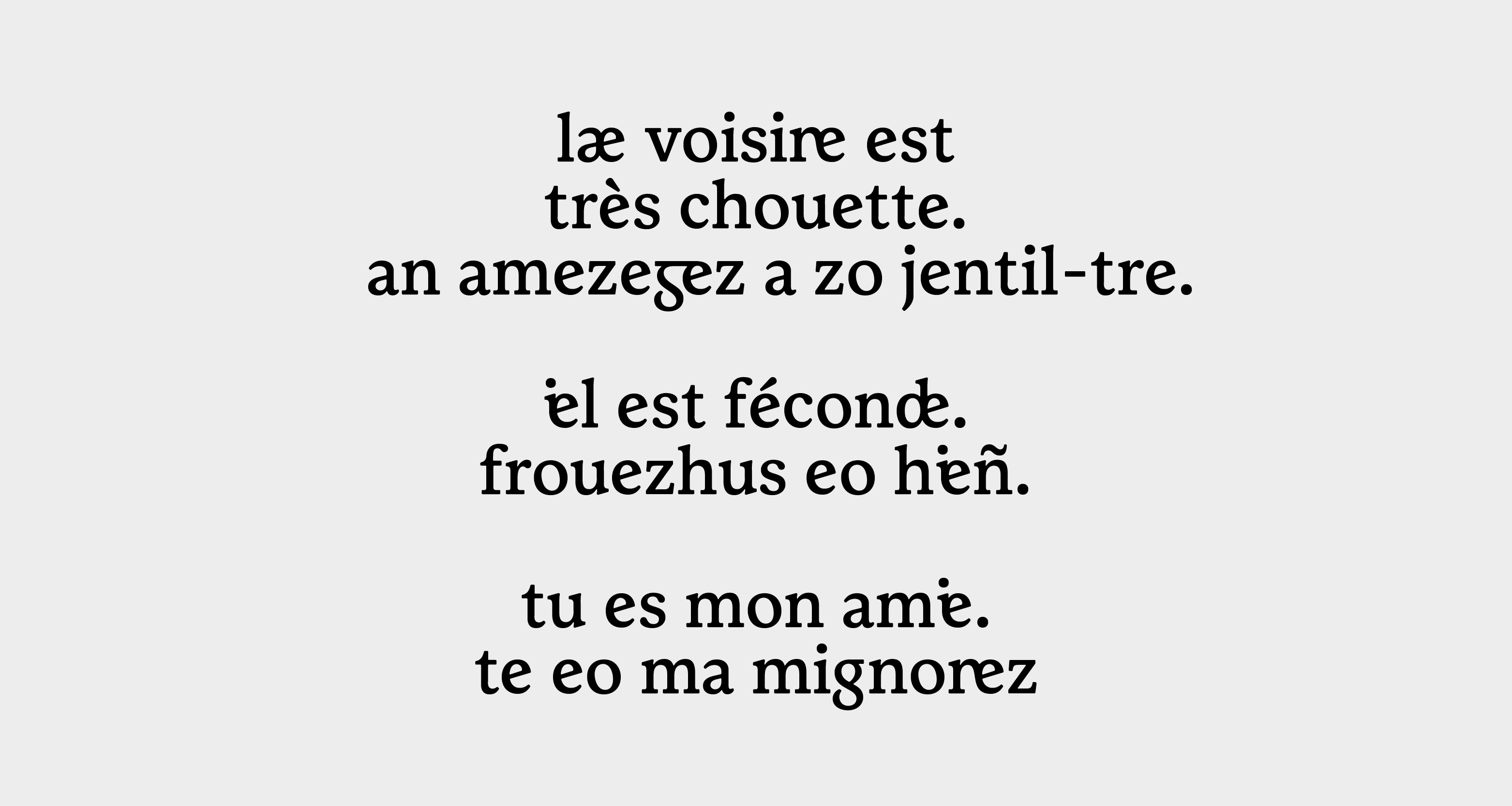 C’est dans ce cadre que s’inscrit ce projet de recherche, qui interroge la place de la typographie dans la préservation et l’évolution des langues minoritaires, avec comme point de départ l’observation du comportement du texte en breton. Comment un caractère typographique peut-il contribuer à la lisibilité, à la vitalité et à la reconnaissance du breton? Conçu avec la volonté de couvrir et d’accompagner le plus précisément possible les usages les vastes possibles du breton écrit, ce caractère cherche à favoriser la lecture longue tout en intégrant des préoccupations actuelles telles que l’écriture inclusive et les usages numériques. Par ce biais, la recherche interroge aussi la responsabilité des designers face à la charge symbolique des formes typographiques et aux récits culturels qu’elles véhiculent.