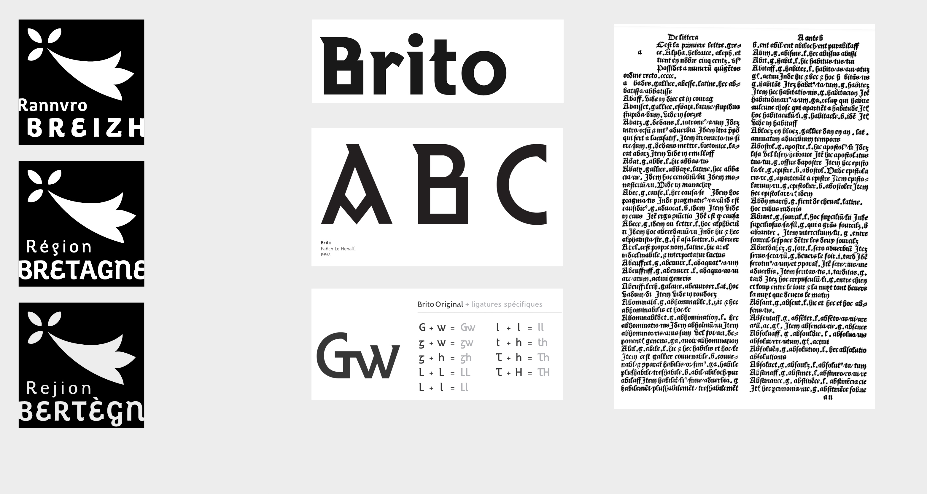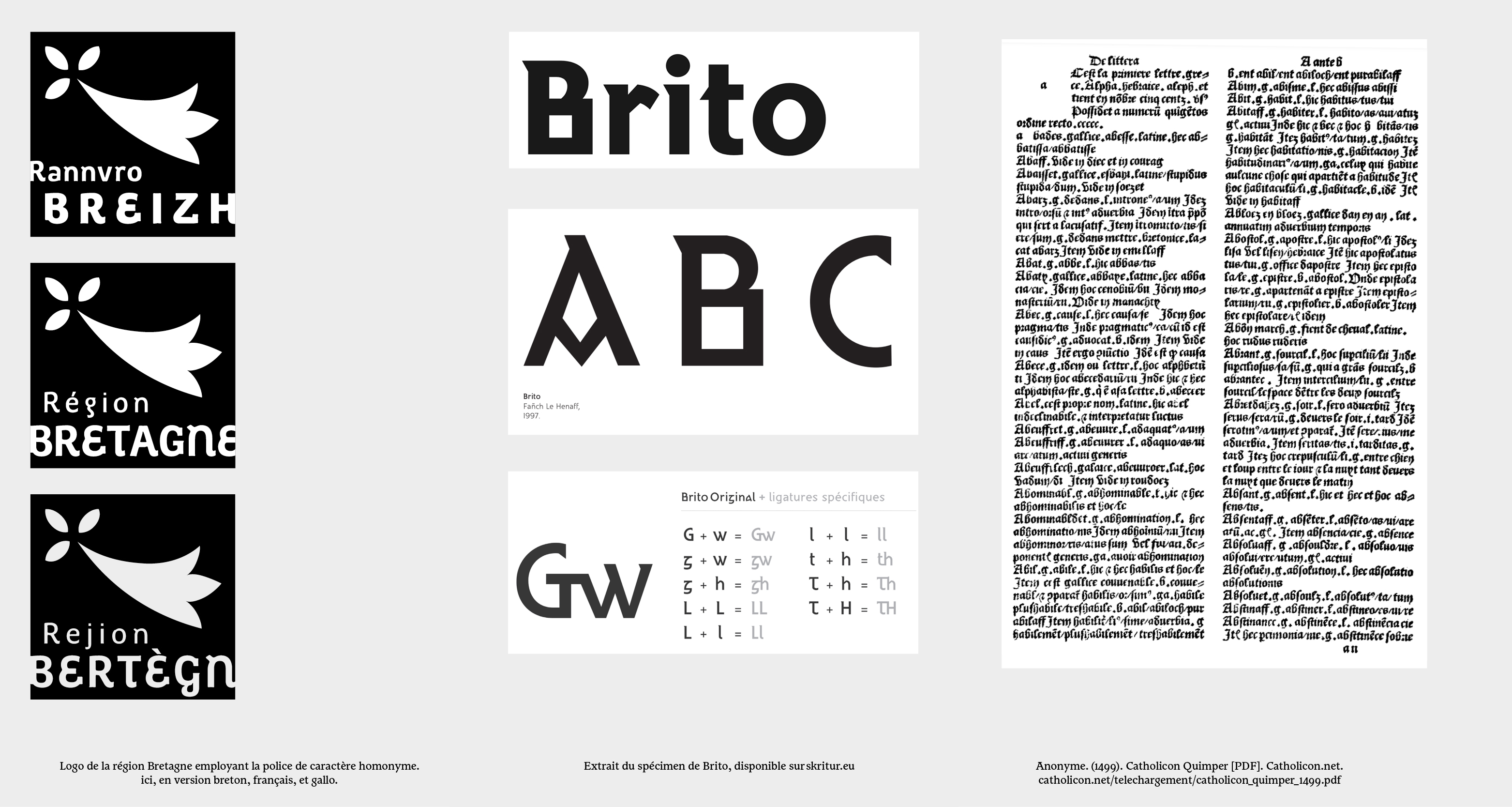 Concevoir une typographie pour les langues brittoniques implique de respecter leurs spécificités orthographiques et graphiques. Le breton, avec son ñ, ù, ses digrammes ch/c’h et ses signes distinctifs (comme le k et le g barrés), illustre la nécessité d’ajustements précis pour garantir lisibilité et cohérence. Le gallo, langue d’oïl de Haute-Bretagne, souffre d’une absence de norme écrite (bien que la graphie ABCD semble s’imposer) et d’une faible reconnaissance, ce qui pourrait freiner l’émergence d’une identité typographique propre. En comparaison, le gallois intègre ses digrammes comme lettres à part entière, et les langues gaéliques perpétuent une tradition graphique singulière avec leur alphabet insulaire.