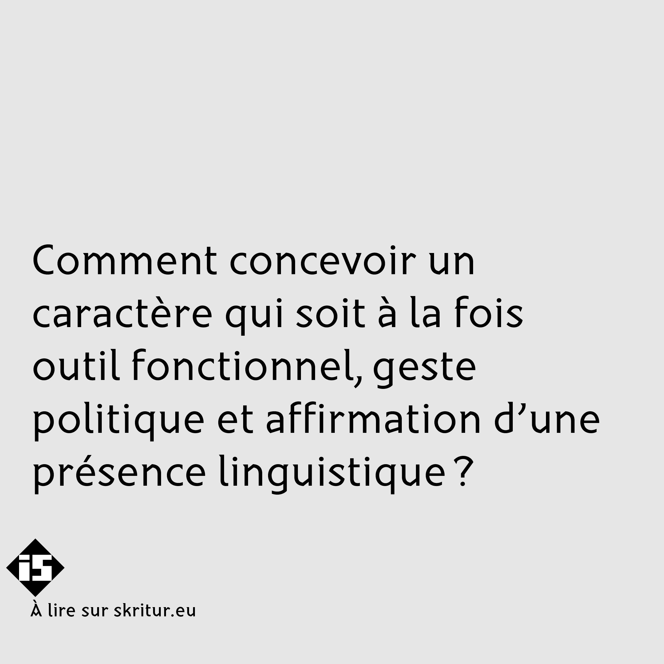 Pour Béatrice Warde dans son essai “The Crystal Goblet, or Printing Should Be Invisible” la typographie de texte, par essence, doit s’effacer derrière le contenu. Pourtant, dans un contexte de création géographiquement située, où les caractères participent à l’affirmation d’une présence linguistique, comment négocier cette tension entre invisibilité et expression? Pourquoi et comment concevoir une typographie qui soit à la fois outil fonctionnel, geste politique, affirmation d’une présence linguistique? Dans quelle part de création, de médiation ou de traduction les designers interviennent dans ce contexte? Et, plus largement, quel rôle la typographie peut-elle jouer dans les processus de revitalisation linguistique?