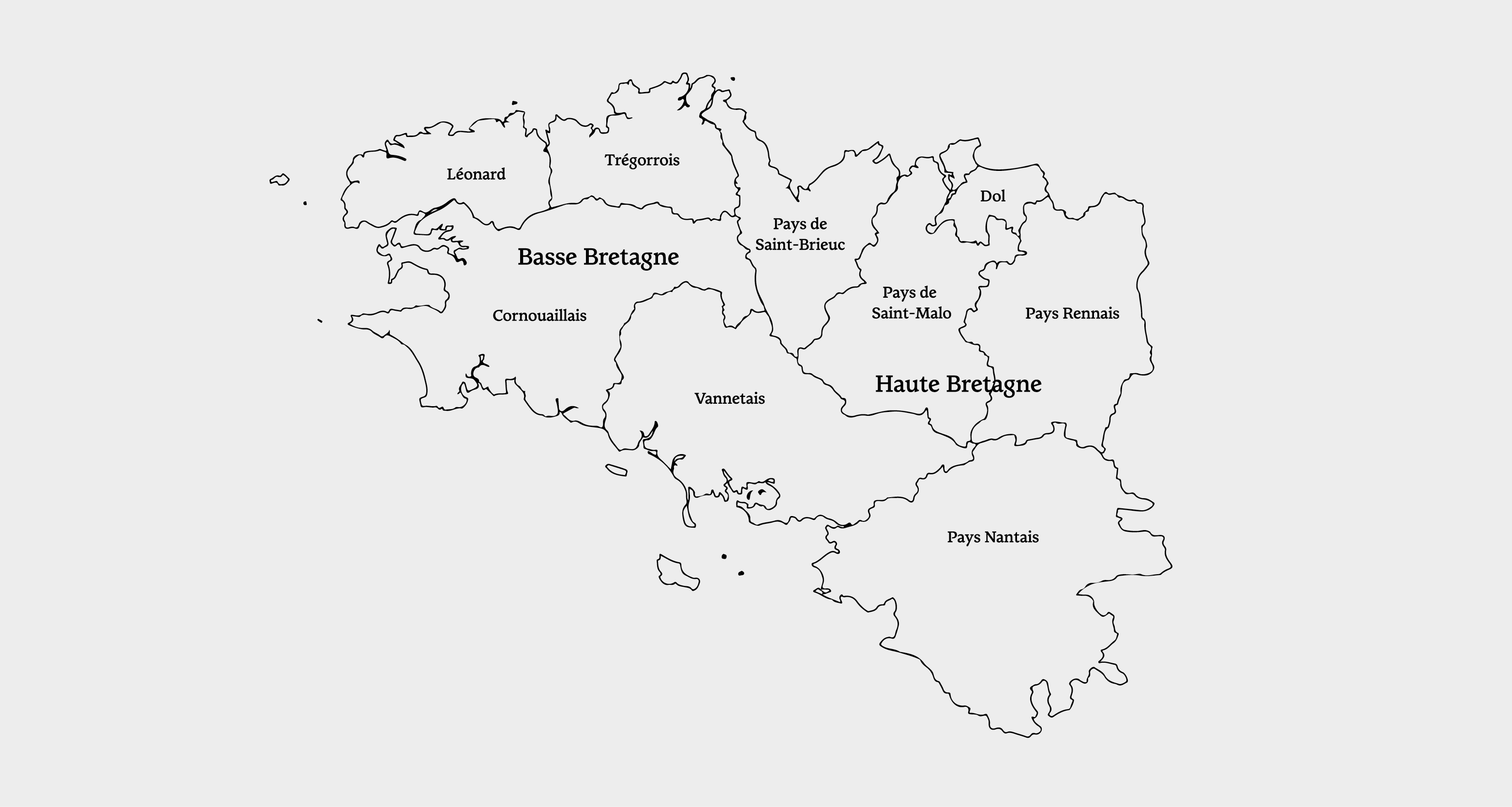 2. Carte des provinces historiques de la Bretagne, on distingue la Haute-Bretagne, à majorité gallophone, et la Basse-Bretagne, à majorité brittophone.