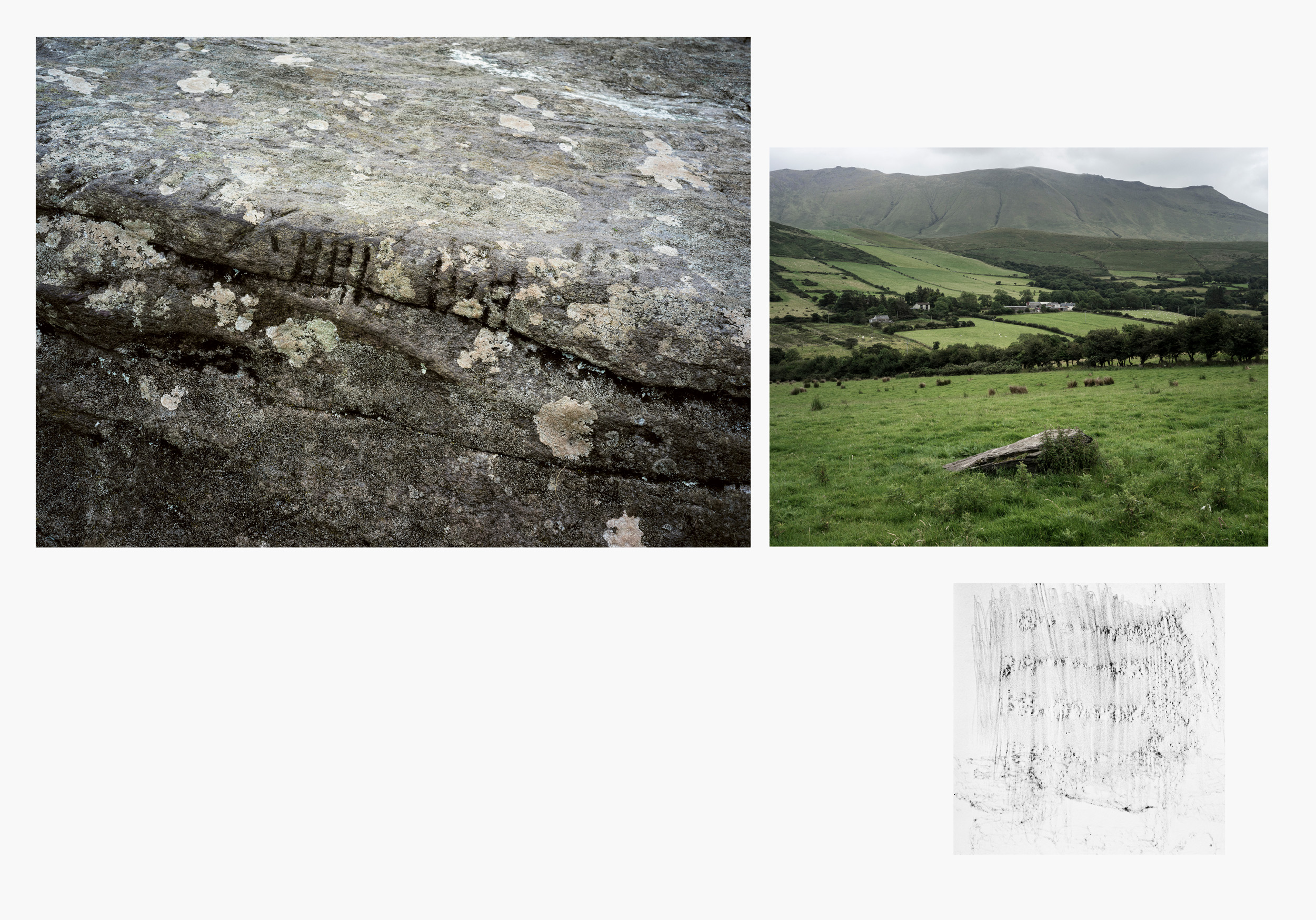 Les pierres oghamiques sont des pierres qui présentent une écriture sculptée. Elles constituent un support à des messages écrits et sont en elles-mêmes une écriture dans le paysage. On les rencontre en marchant dans les champs, ou en parcourant des sites archéologiques bien repérés. L’origine de cette écriture comme son étymologie demeure assez mystérieuse bien que nous puissions transcoder cette écriture dans notre alphabet. Nous en proposons ici une lecture visuelle qui s’accompagne d’une série photographique mettant en relation la pierre et son environnement (1). Chaque pierre est associée au paysage qui l’entoure, chaque paysage représente en somme le point de vue de la pierre comme lieu choisi de l’inscription épigraphique. Les images sont parfois associées à des « frotographies », relevés de l’inscription sur du papier par contact à même la surface minérale. L’écriture gravée, revient alors sur le papier par une trace fragile.