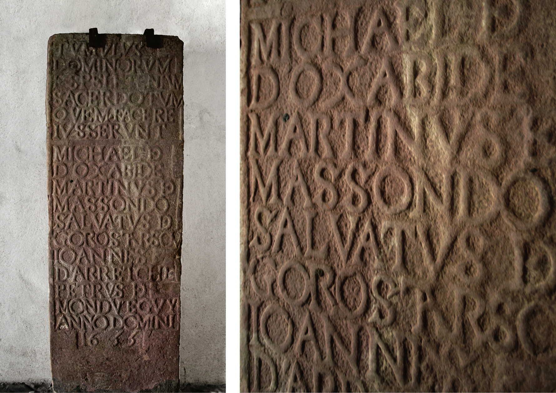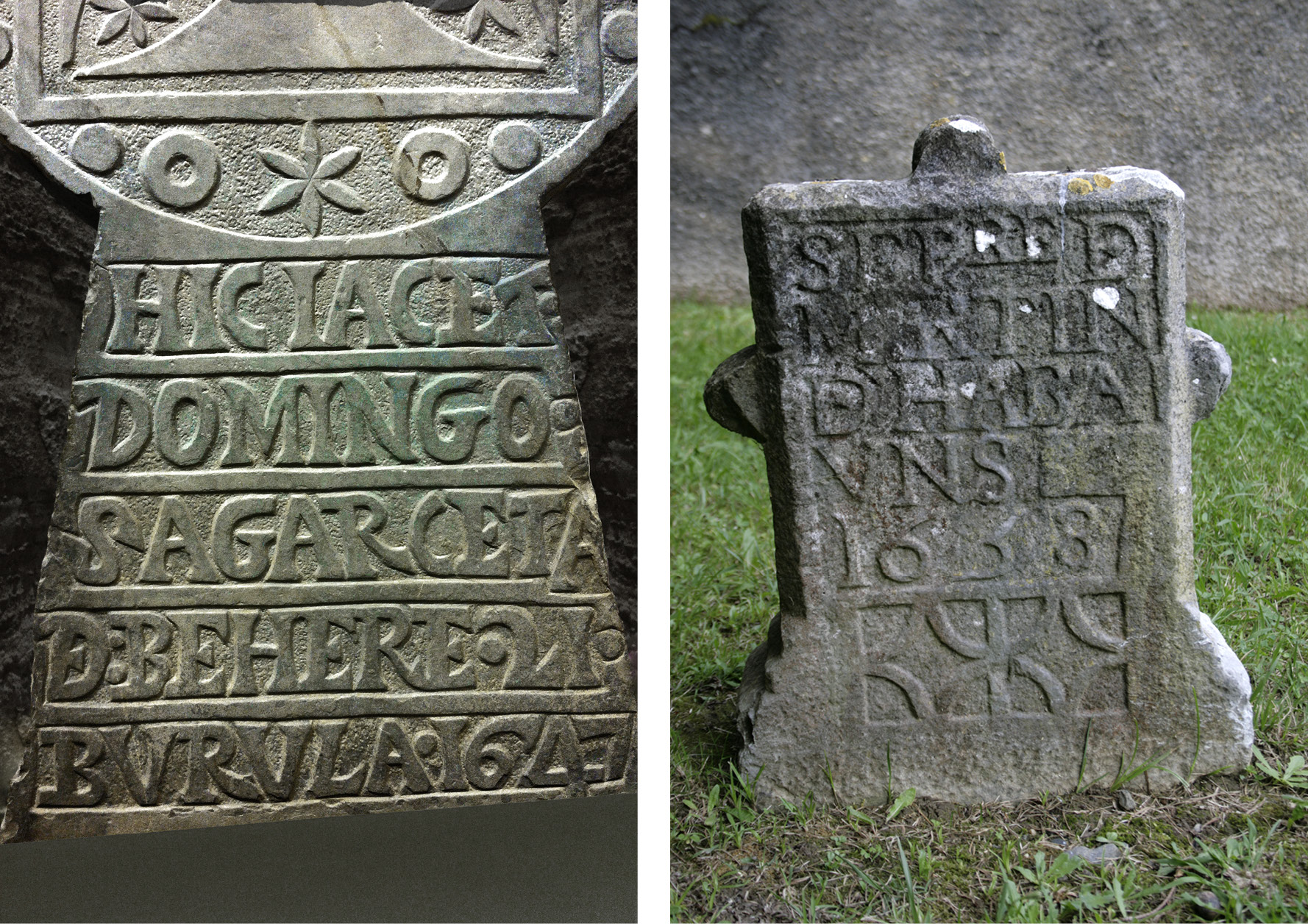La pierre, ce sont aussi les linteaux à l’entrée des maisons pour que nous n’oubliions pas les noms de leurs premiers habitants. La pierre, que ce soit dans les maisons ou dans les tombes, a conservé jusqu’à aujourd’hui des formes et des usages qui, autrement, auraient été perdus. Lorsque l’on parle d’épigraphie au Pays basque français, il est inévitable de mentionner le travail de l’archéologue Louis Colas et sa formidable contribution à la collecte, au catalogage et à la reproduction de ces inscriptions. Dans son ouvrage intitulé La Tombe basque*, nous trouvons plus de mille illustrations réalisées dans les moindres détails par Louis Colas lui-même entre 1906 et 1923.