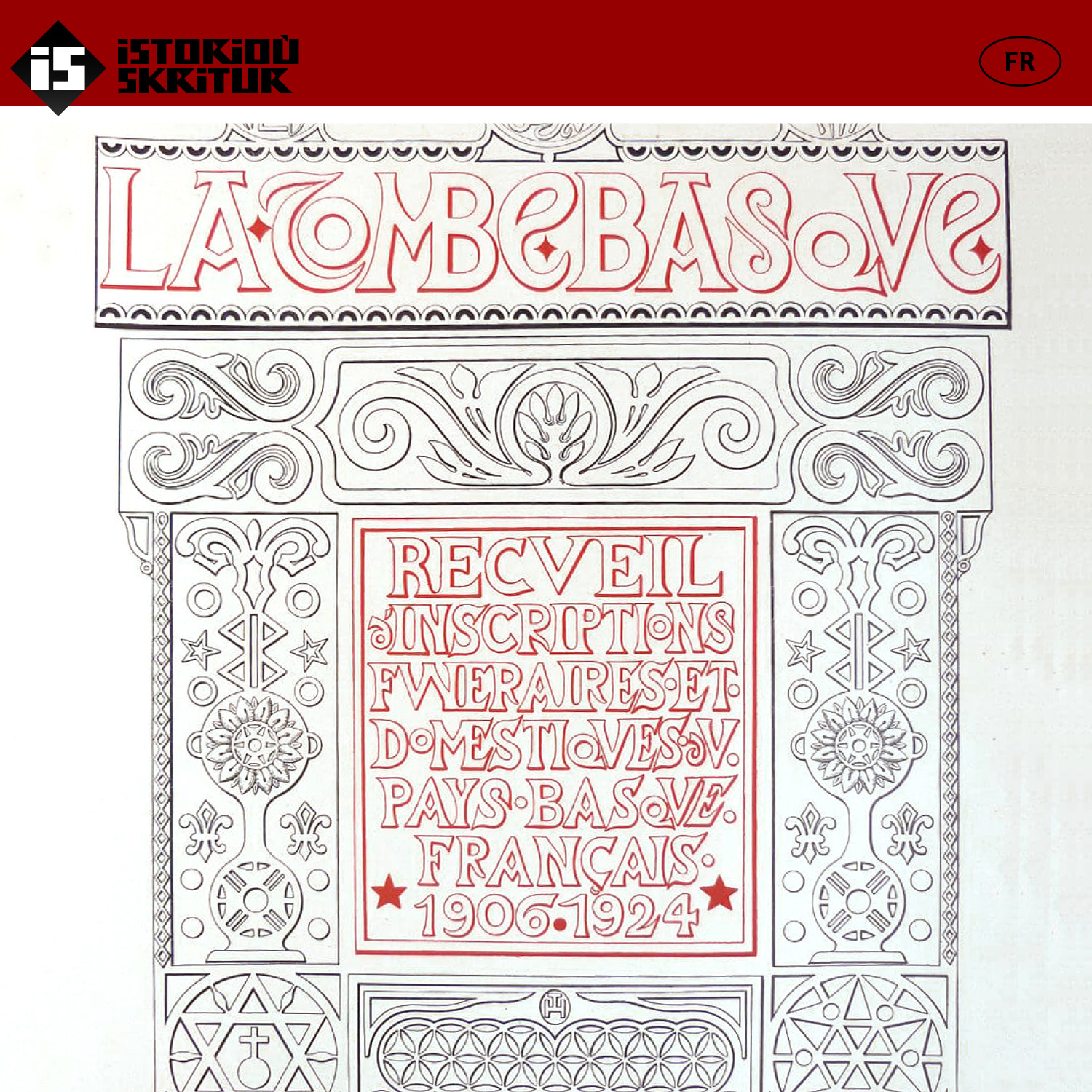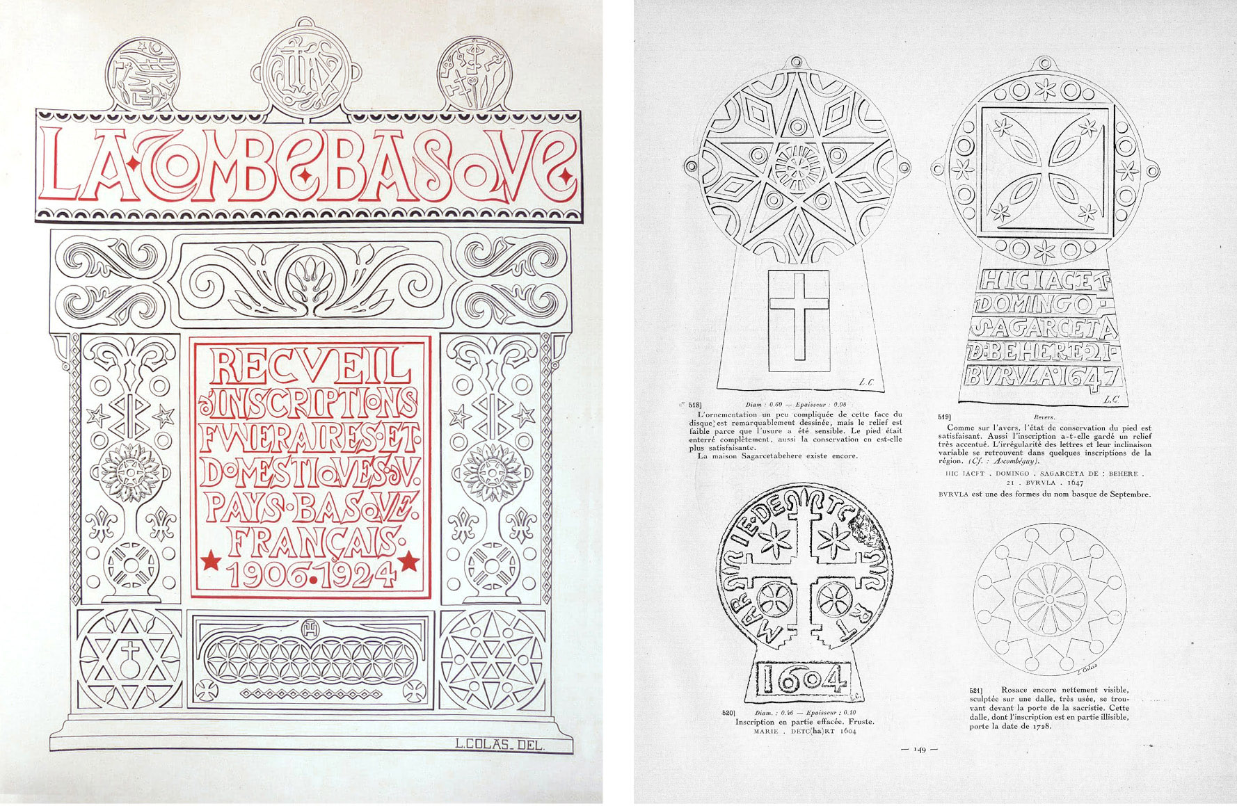 Dans cette collection très vaste et exhaustive, on trouve surtout des stèles funéraires, des pierres tombales et des linteaux inscrits de différentes époques. Les inscriptions les plus anciennes remontent au XVIIe siècle. L’état de conservation critique de certaines d’entre elles est à l’origine de la collection de Colas. Cette volonté de préserver ces manifestations de l’épigraphie locale est sans doute influencée par la naissance des premiers mouvements de revendication identitaire et culturelle qui surgissent à cette époque de part et d’autre de la frontière franco-espagnole, connus sous le nom d’Euskal Pizkundea (Renaissance basque) et qui constituent le germe de ce qui deviendra plus tard le nationalisme basque. Quoi qu’il en soit, son originalité ne réside pas précisément dans son origine - on trouve des exemples comparables en termes de style et de datation ailleurs en Europe - mais plutôt dans une récupération postérieure qui ne s’est pas produite avec la même ampleur dans d’autres lieux où des inscriptions similaires existaient. En ce sens, il est particulièrement important de mettre en valeur des œuvres comme celle de Louis Colas à une époque – le début du XXe siècle – qui coïncide avec la montée des mouvements régionalistes en faveur d’une culture autochtone différenciée de la culture française ou espagnole. Ces différences sont visiblement soulignées dans une variété de manifestations allant de la peinture à l’architecture, en passant par la typographie et le lettrage. Selon les propres termes de Colas, tout cela reflète “ce goût assez récent pour tout ce qui représente le pays dans lequel on vit”**. Un exemple très significatif de cette tendance est la couverture du livre de Louis Colas, où l’auteur fait un étalage de ressources en utilisant plusieurs des formes les plus distinctives trouvées au cours de son travail sur le terrain.