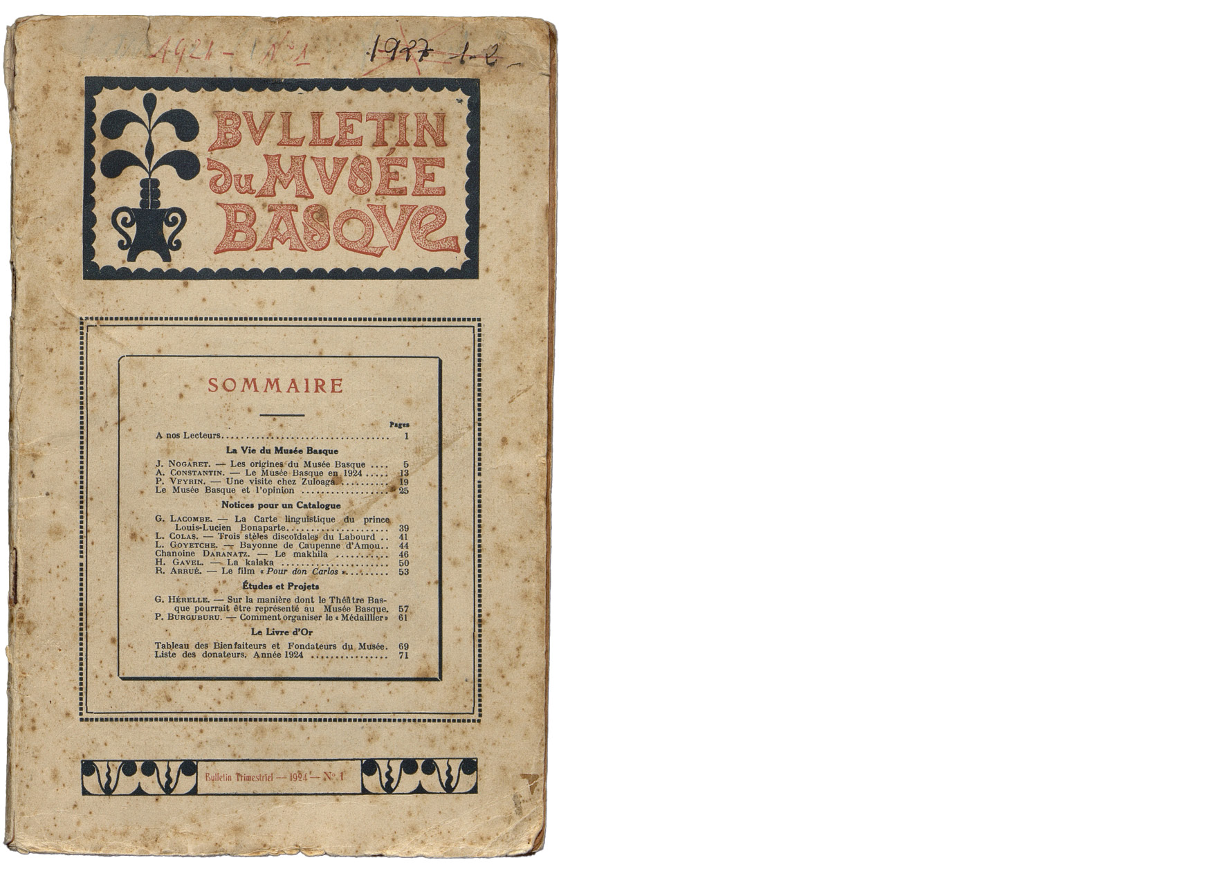 On retrouve des formes similaires dans diverses publications de l’époque et, bien sûr, dans le bulletin du Musée Basque de Bayonne [fig. 5], qui ouvrit ses portes au public en février 1924, et dans lequel on retrouve certaines des inscriptions figurant dans le livre de Colas.