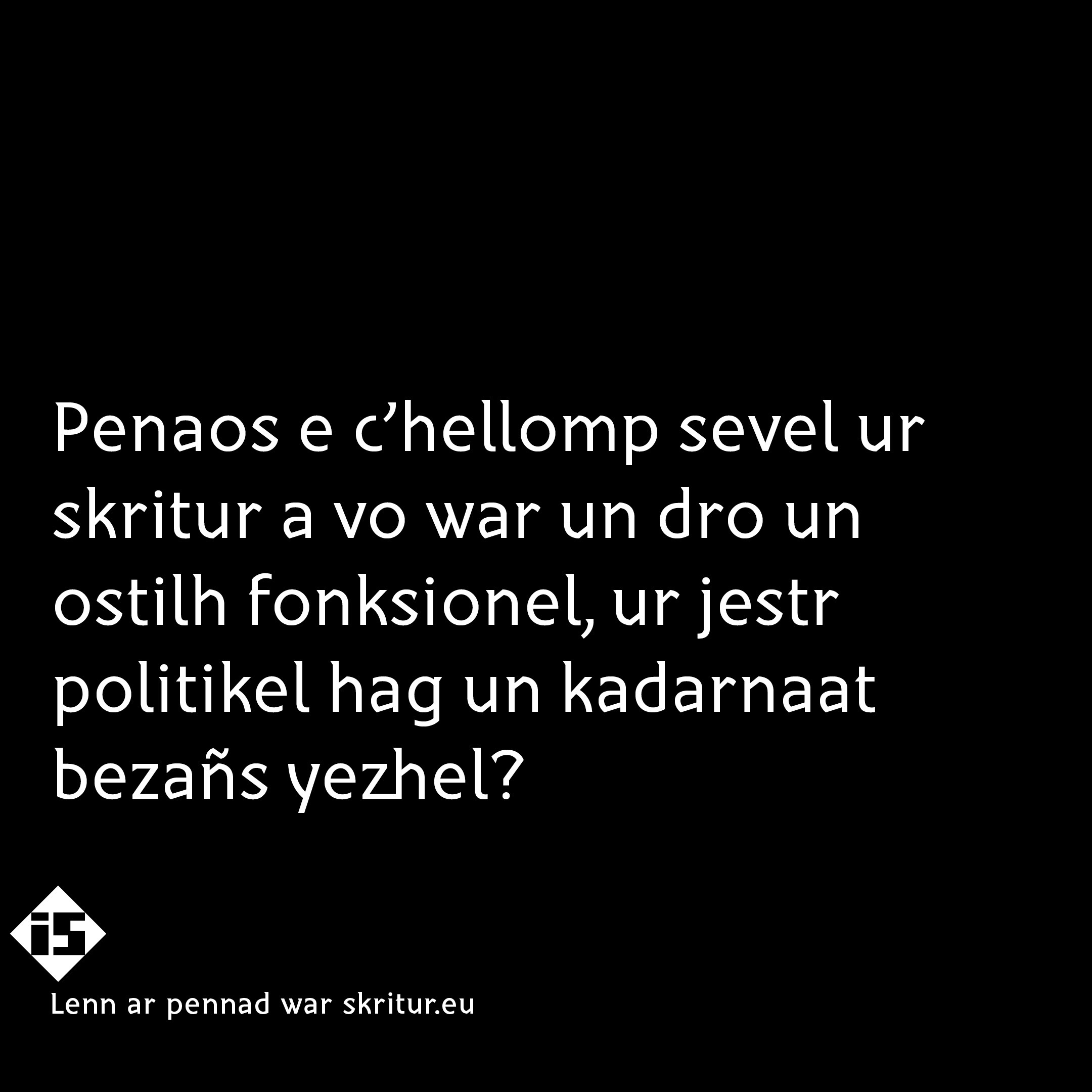 On peut s’interroger sur la manière de traduire les dynamiques linguistiques bretonnes et gallèses en formes typographiques. Affirmer une identité sans sacrifier la lisibilité, intégrer des références culturelles tout en évitant les clichés. Le dessin des lettres devient un espace de négociation de l’expression et de la fonctionnalité, particulièrement dans un contexte multilingue (français, breton, gallo).