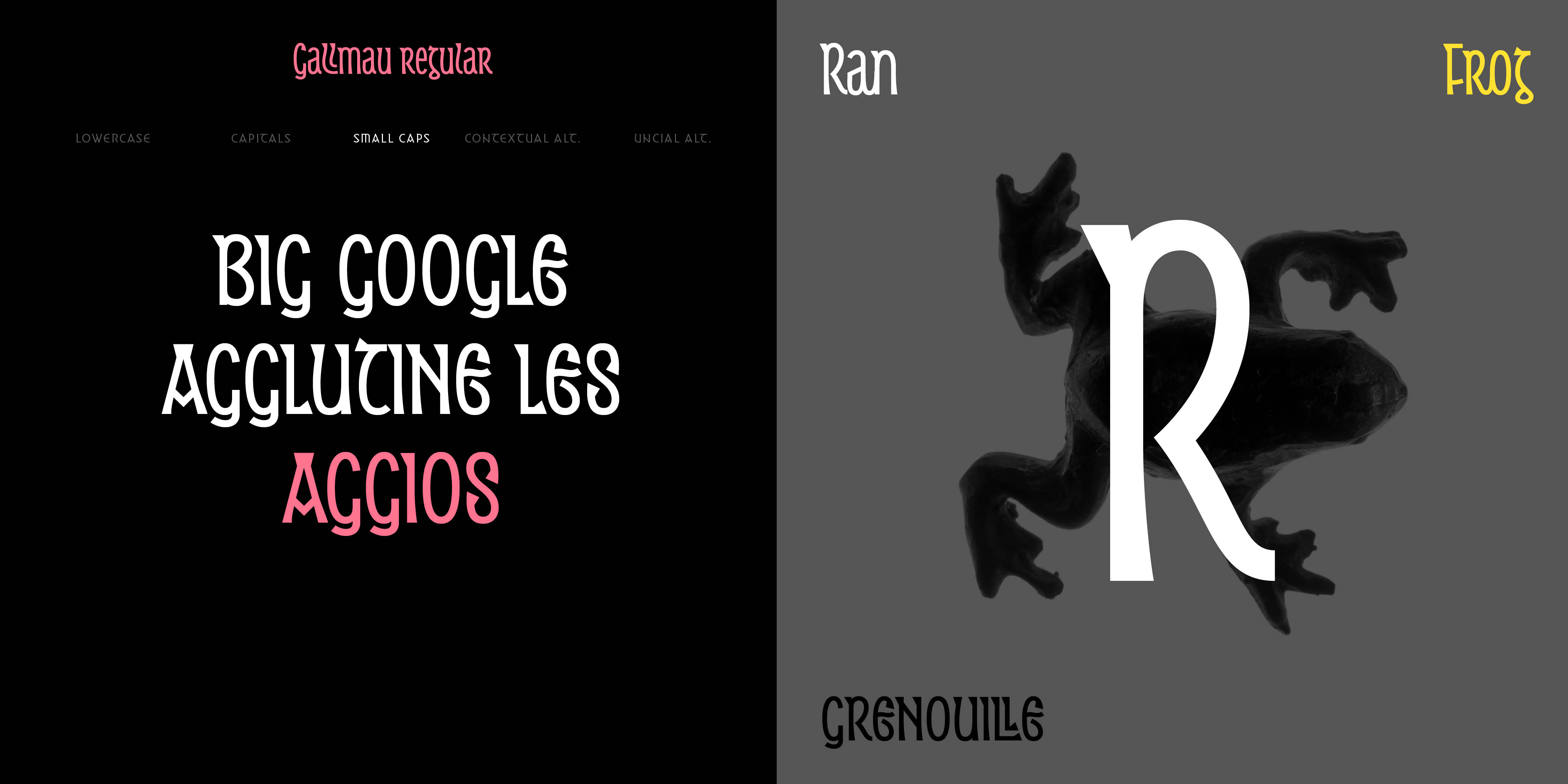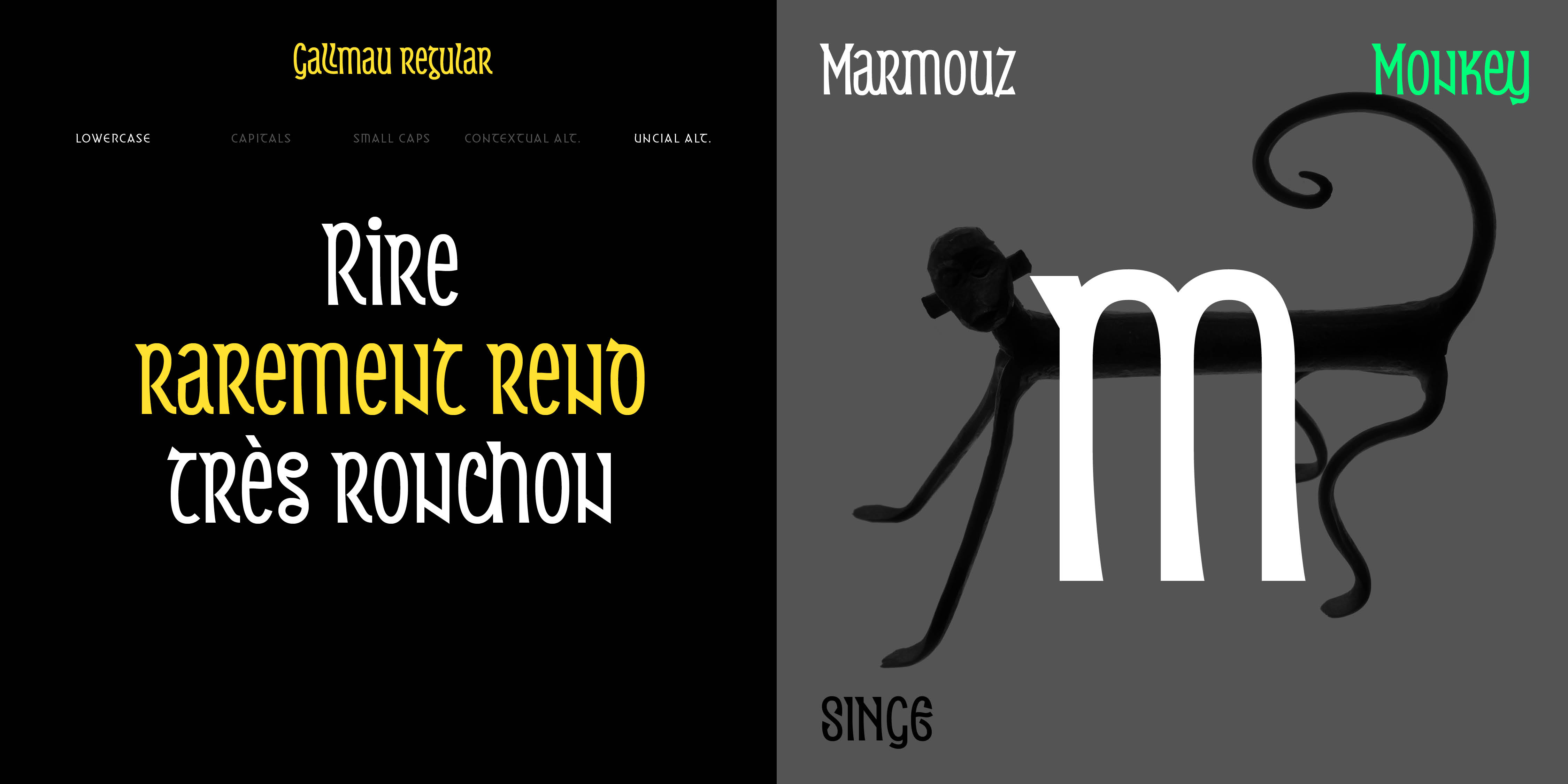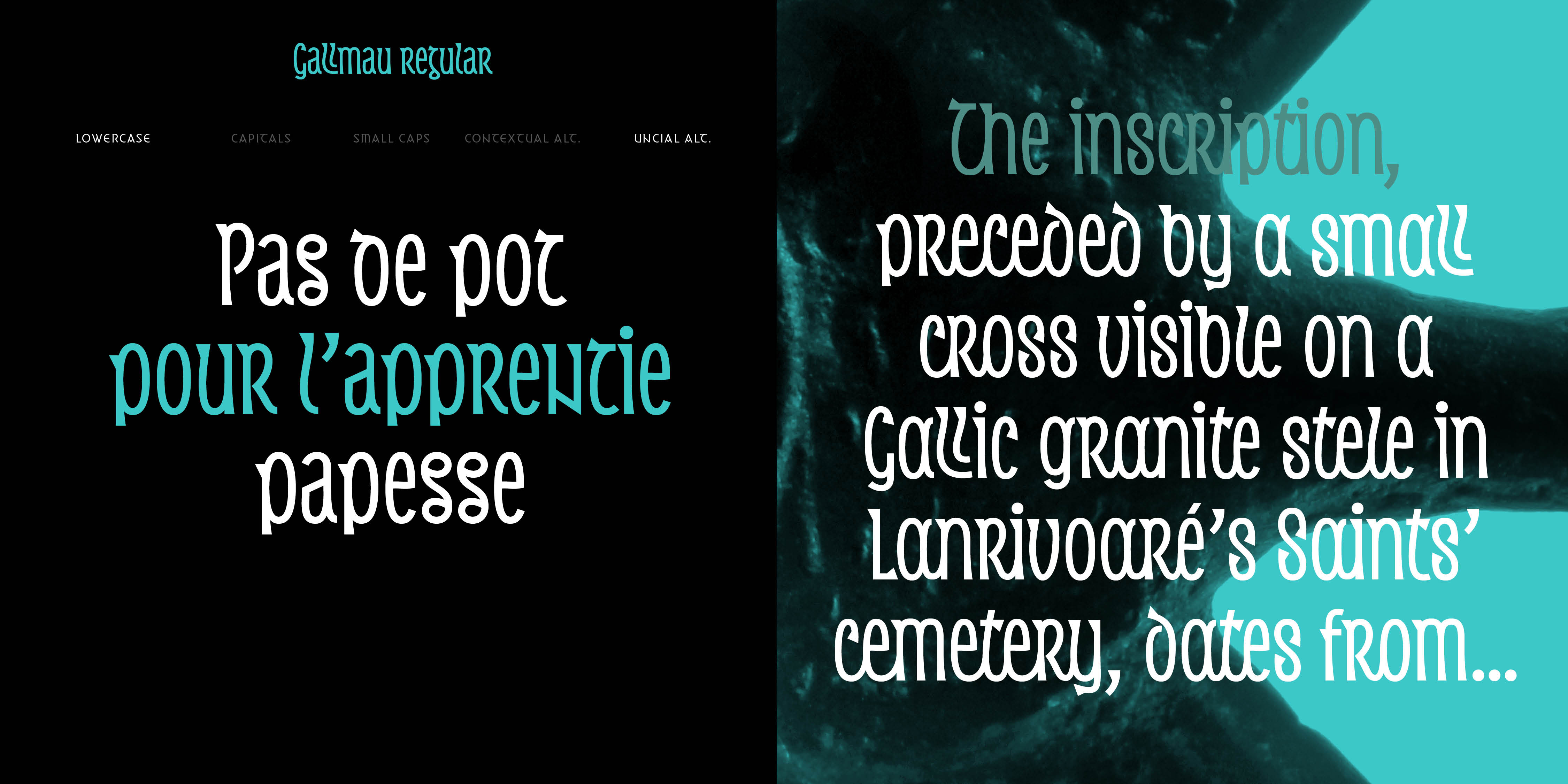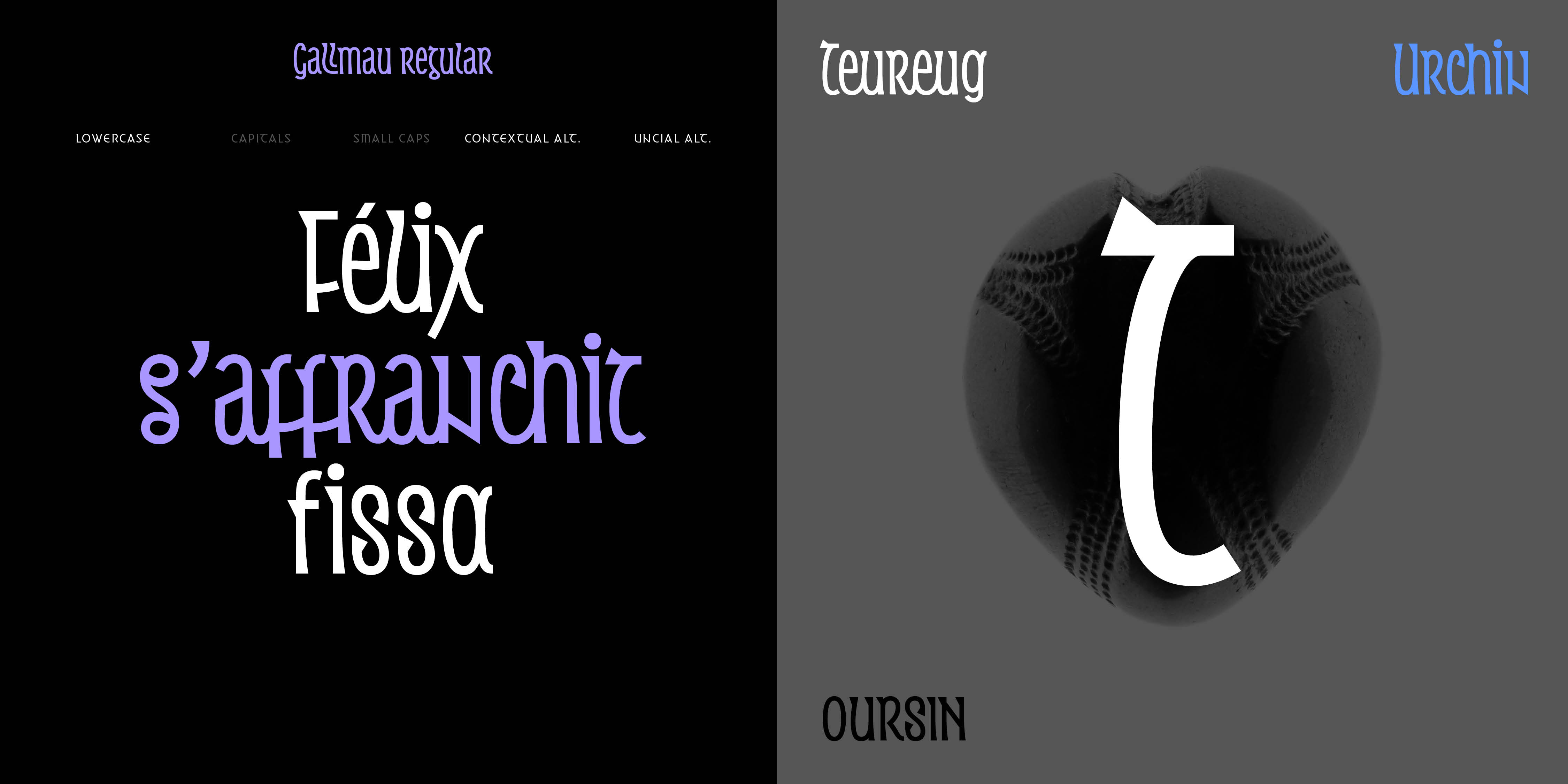 Gallmau is a free typographic interpretation of the uncial found on Irish and English illuminated manuscripts from the 7th century onwards. The monks not only copied the Roman uncial, but also created their own script, the insular half-uncial, which incorporated influences from pagan Celtic and English art into the Latin alphabet. Among the finest surviving manuscripts are the Book of Durrow (664–700), the Lindisfarne Gospels (700) and the Book of Kells (Iona and Kells 800). The signs share the same height, the general layout is fluid and certain pairs of letters are attached, creating a remarkable regularity of lines. From the uncial, Gallmau retains the links between signs and the possibility of composing indifferently with upper or lower case forms. On the other hand, the stroke changes – the module is narrower, allowing to set the words in a compact way – and the thick & thin stroke effects caused by the quill are erased in favor of a more contemporary monolinear script.