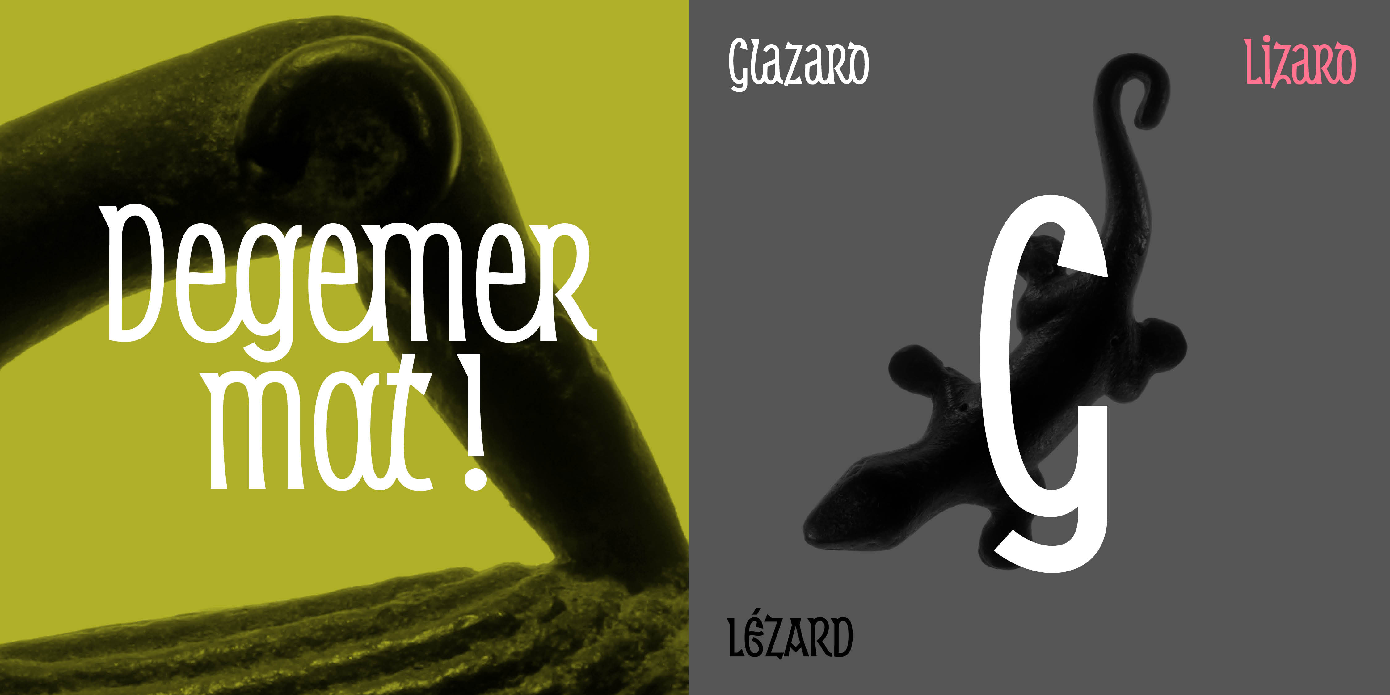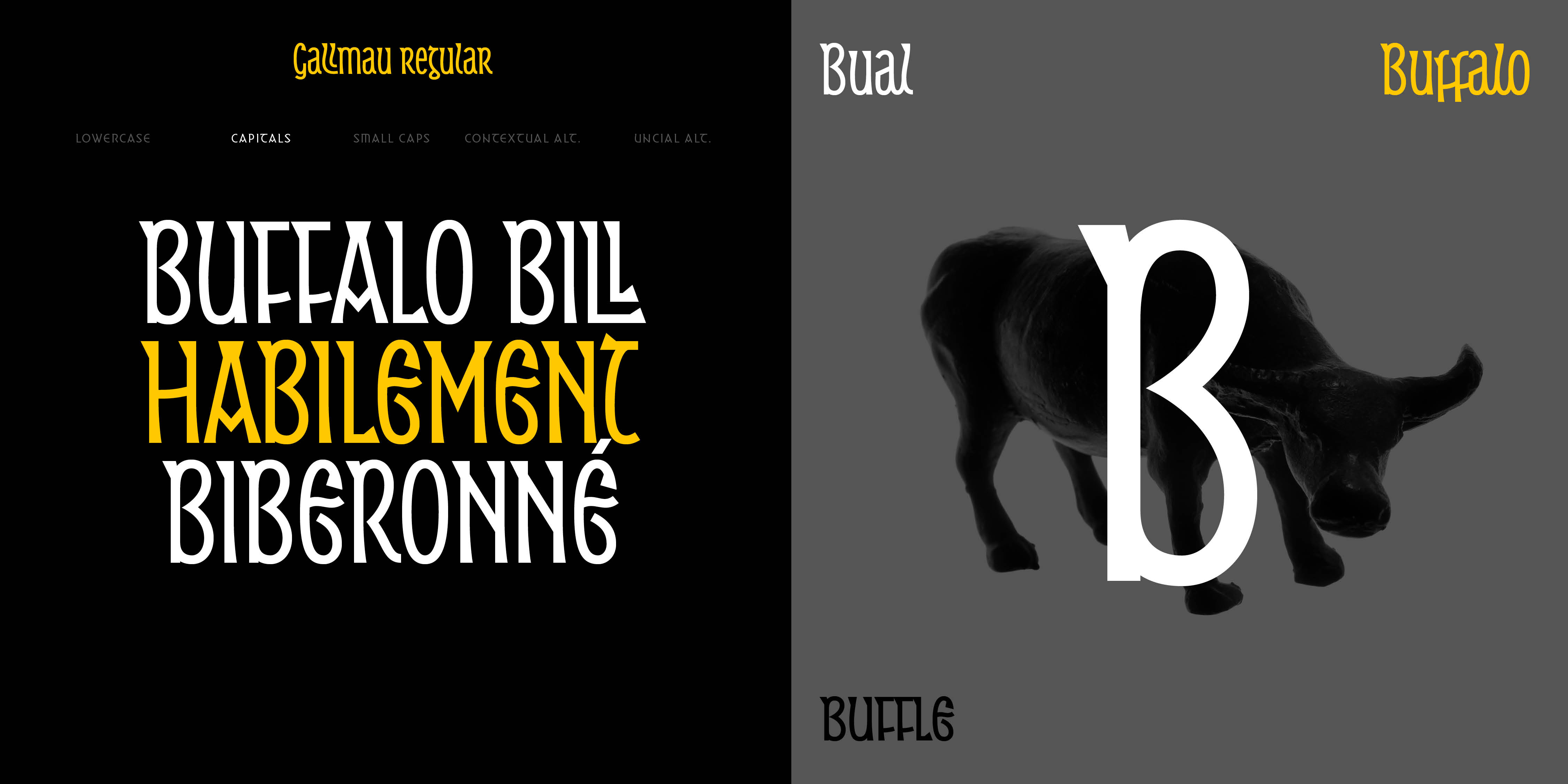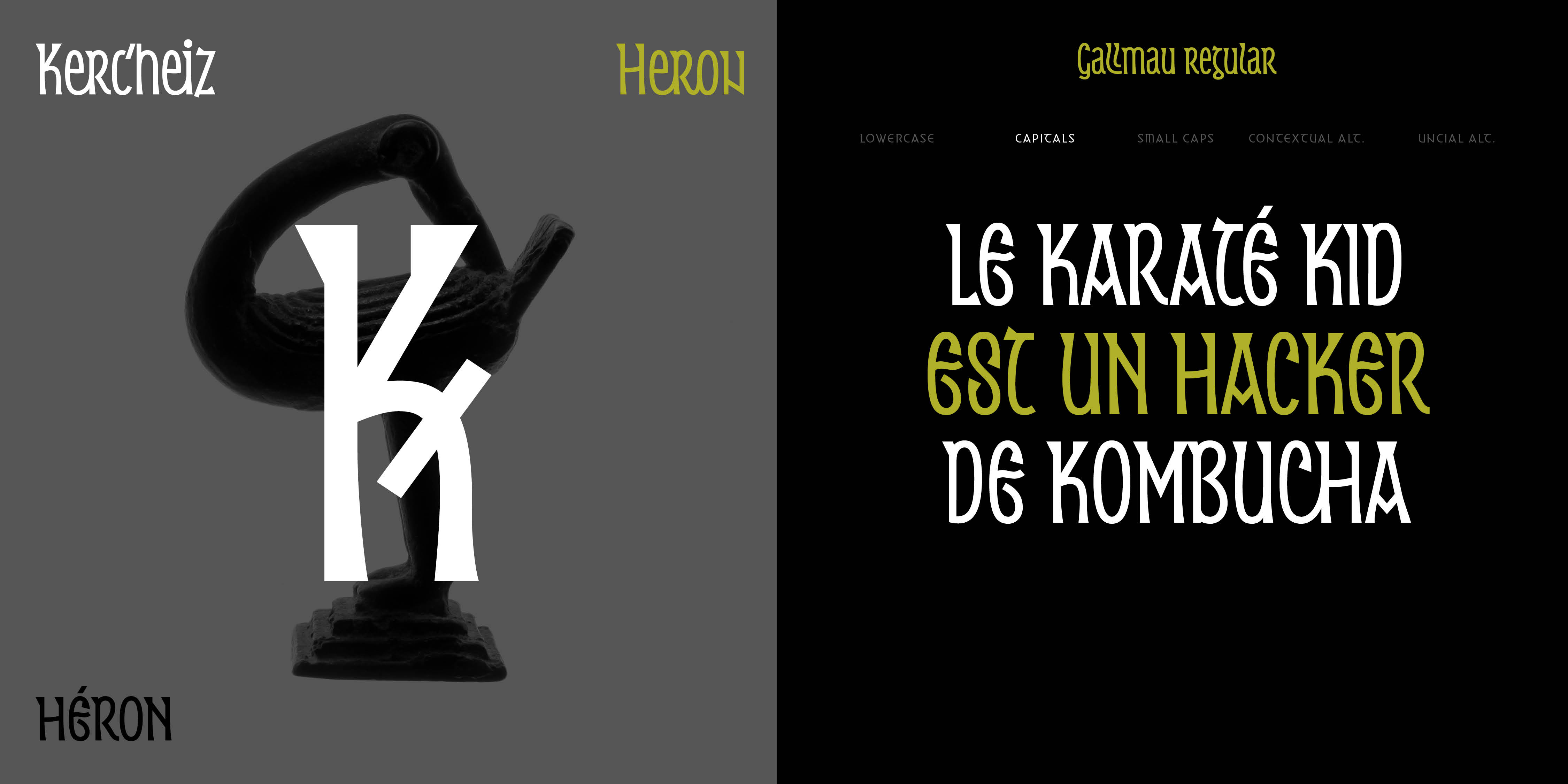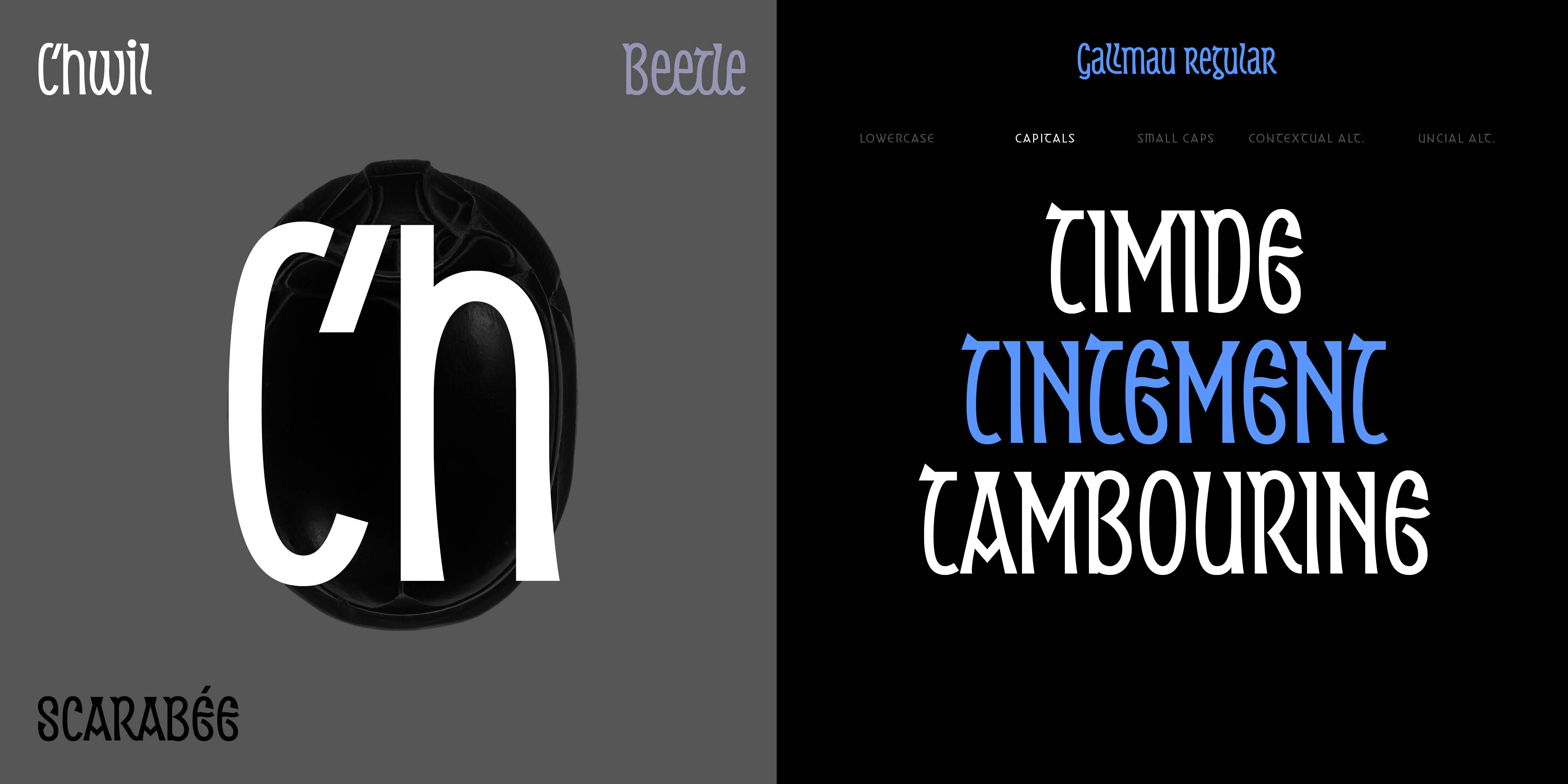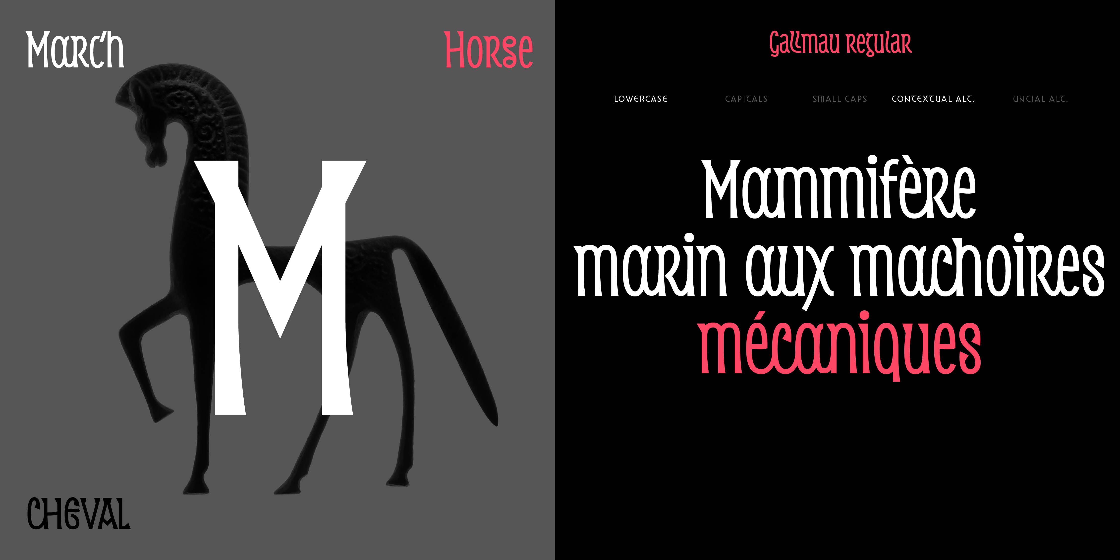 Gallmau is a free typographic interpretation of the uncial found on Irish and English illuminated manuscripts from the 7th century onwards. The monks not only copied the Roman uncial, but also created their own script, the insular half-uncial, which incorporated influences from pagan Celtic and English art into the Latin alphabet. Among the finest surviving manuscripts are the Book of Durrow (664–700), the Lindisfarne Gospels (700) and the Book of Kells (Iona and Kells 800). The signs share the same height, the general layout is fluid and certain pairs of letters are attached, creating a remarkable regularity of lines. From the uncial, Gallmau retains the links between signs and the possibility of composing indifferently with upper or lower case forms. On the other hand, the stroke changes – the module is narrower, allowing to set the words in a compact way – and the thick & thin stroke effects caused by the quill are erased in favor of a more contemporary monolinear script.