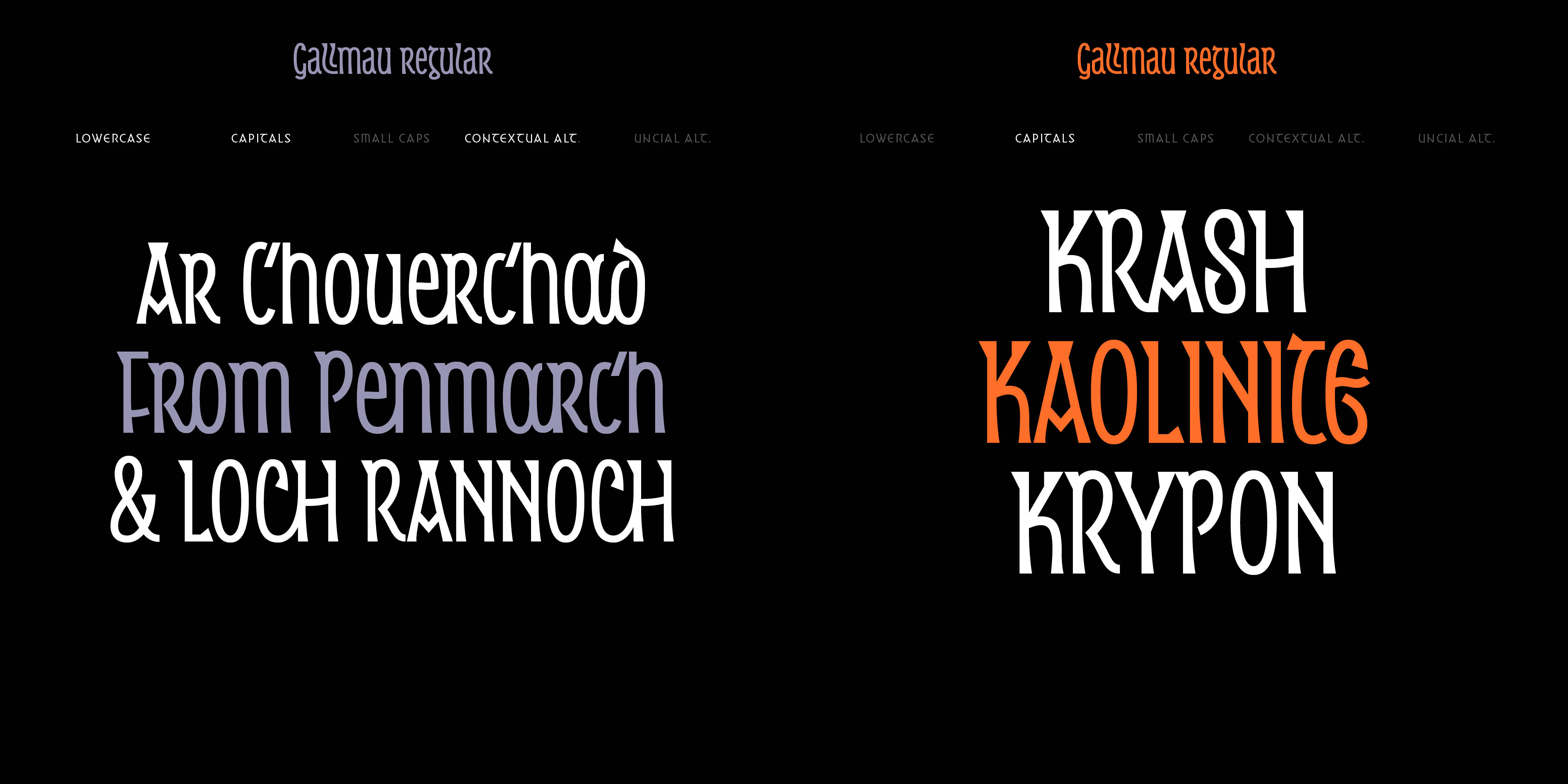 Le Gallmau est une interprétation typographique libre de l’onciale que l’on observe sur les manuscrits enluminés irlandais et anglais à partir du VIIe siècle. Les moines ne se contentent pas de recopier l’onciale romaine, ils créent une écriture propre, la semi-onciale insulaire, qui intègre à l’alphabet latin des influences de l’art païen celte et anglais. Parmi les plus beaux manuscrits qui nous sont parvenus, le Livre de Durrow (664–700), les Évangiles de Lindisfarne (700) et le Livre de Kells (Iona et Kells 800). Les signes partagent la même hauteur, le tracé général est fluide et certaines paires de lettres sont attachées, créant ainsi une remarquable régularité des lignes. De l’onciale, le Gallmau conserve les liaisons entre les signes et la possibilité de composer indifféremment avec des formes majuscules ou minuscules. En revanche, la chasse change – le module est plus étroit, permettant une composition plus compacte des mots – et les effets de pleins et déliés provoqués par la plume sont gommés au profit d’une graphie monolinéaire plus contemporaine.