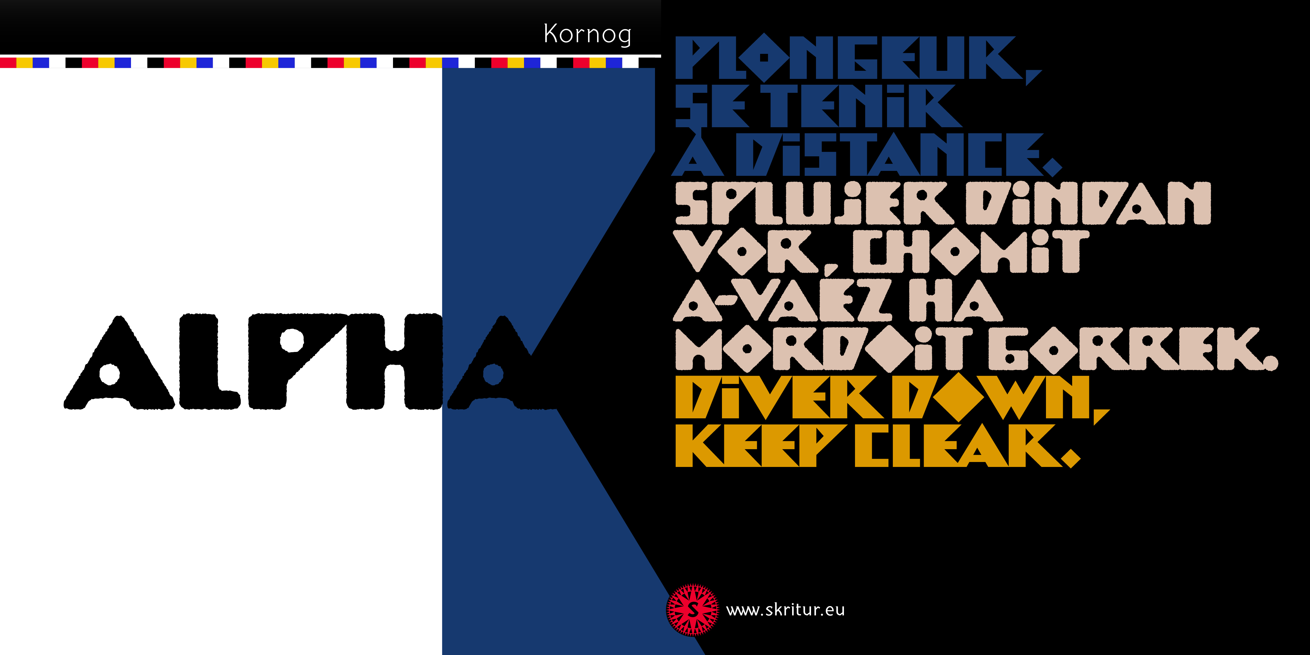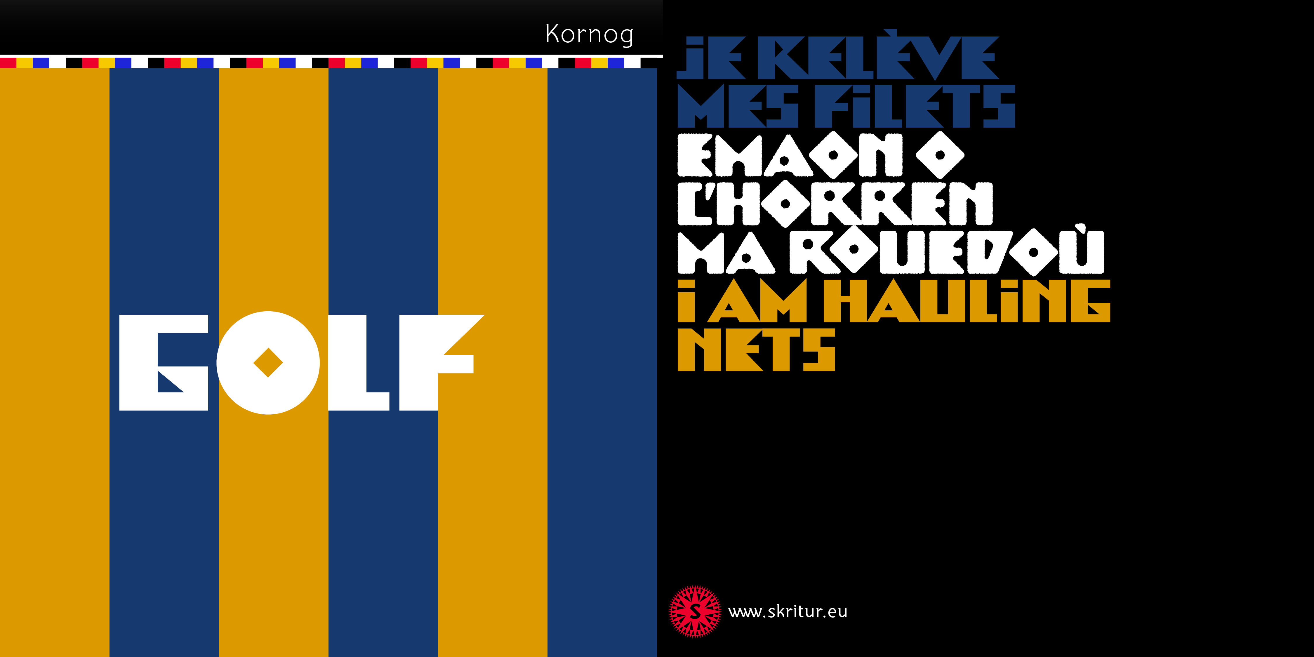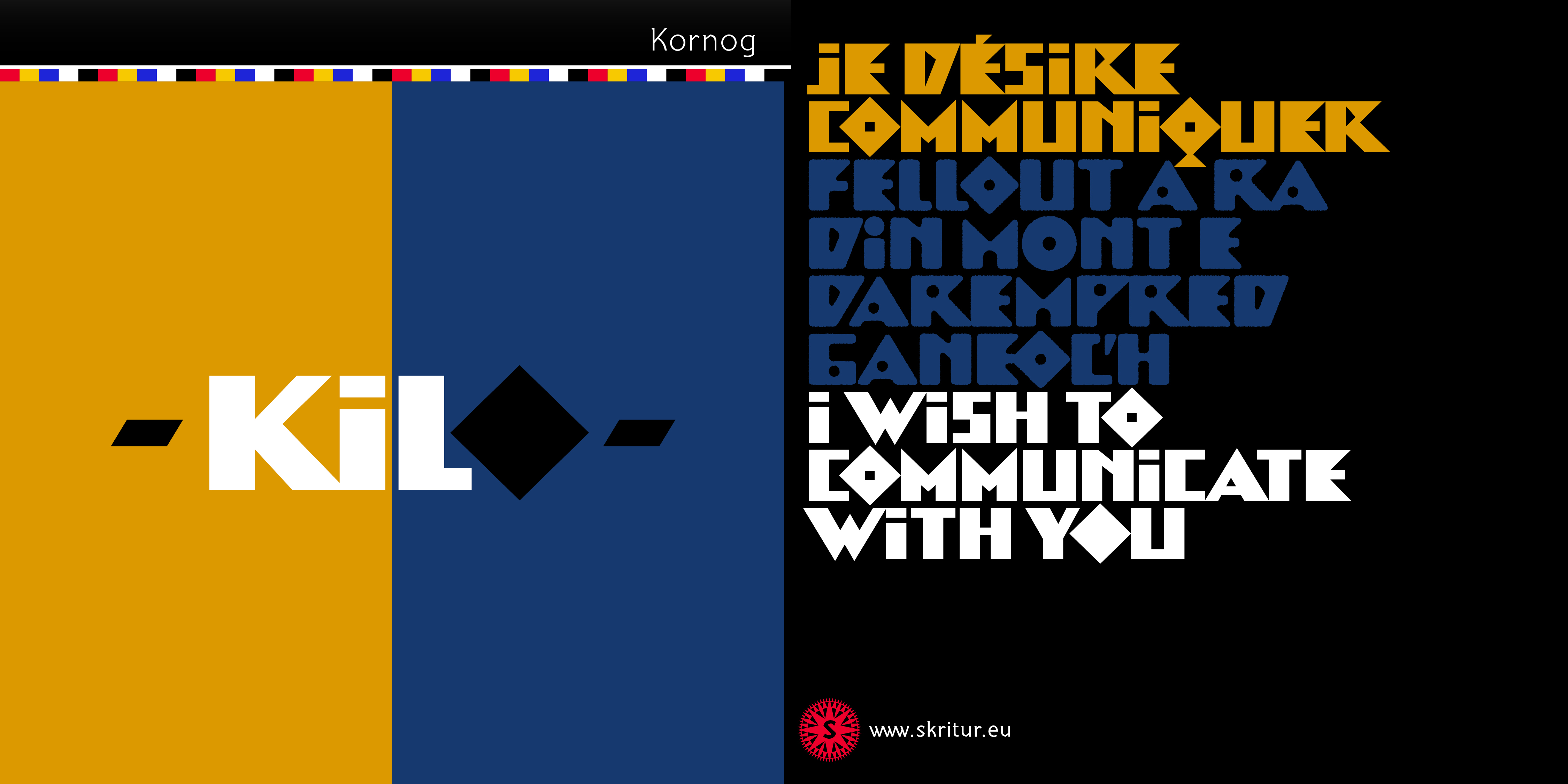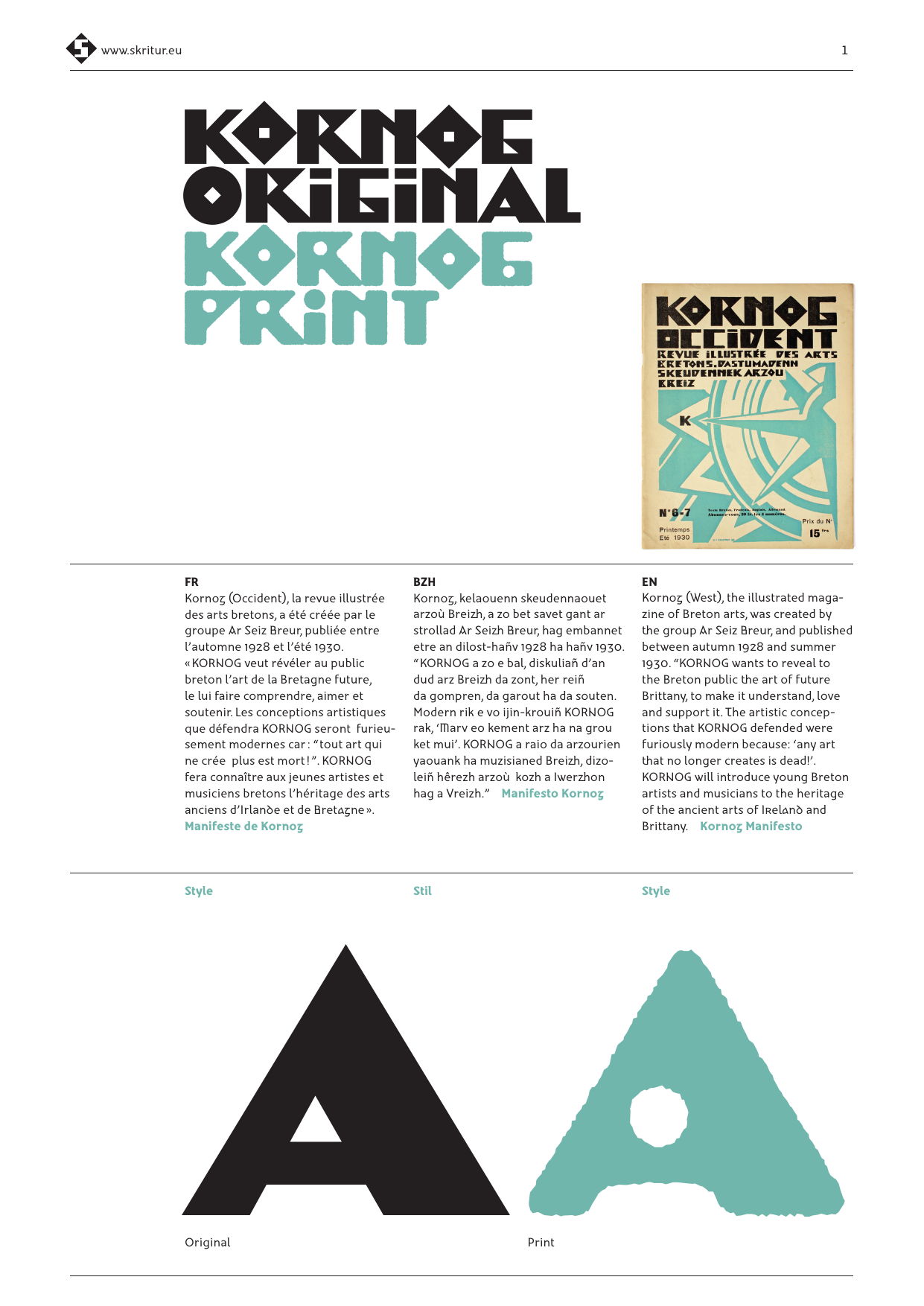 En 1995, lors de la publication de son ouvrage Skritur – typographie & identité, le graphiste Fañch Le Henaff présentait un premier alphabet dessiné à partir de la têtière de la revue, gravée sur bois par René-Yves Creston et Suzanne Candré-Creston, tous deux cofondateurs du collectif, avec Jeanne Malivel et Jorj Robin. Pour célébrer le centenaire du mouvement, le caractère Kornog est aujourd’hui revu et augmenté afin d’en permettre un usage pour le titrage (presse, affiche, édition…) qui n’a rien à envier à la radicalité formelle prônée par ces artistes de l’Art déco breton : géométrique, acéré et puissant. Une version «print» donne au Kornog une saveur rétro où l’on assume les imperfections de l’impression des caractères bois et l’encrage fluctuant d’un tirage à l’autre.