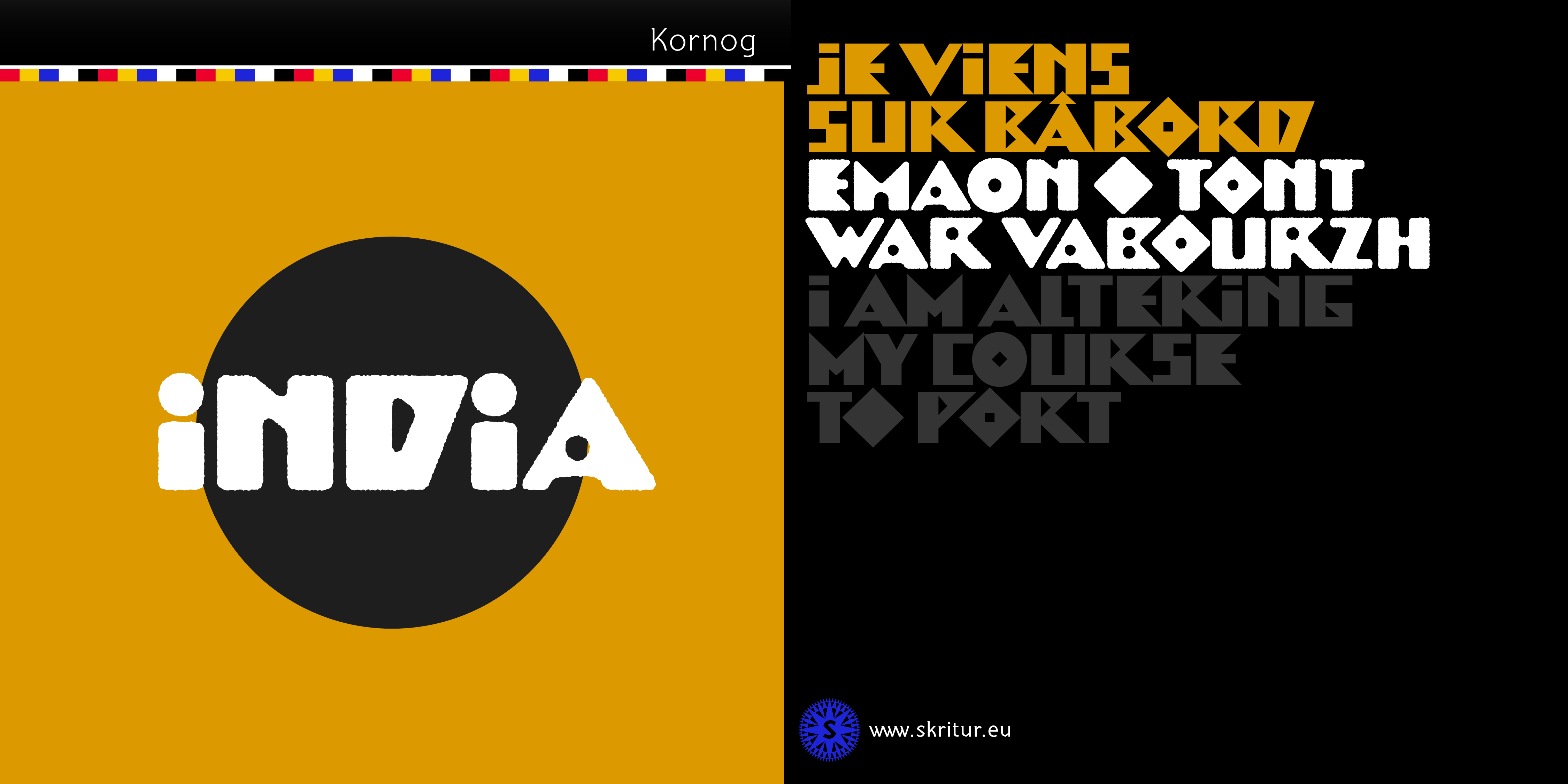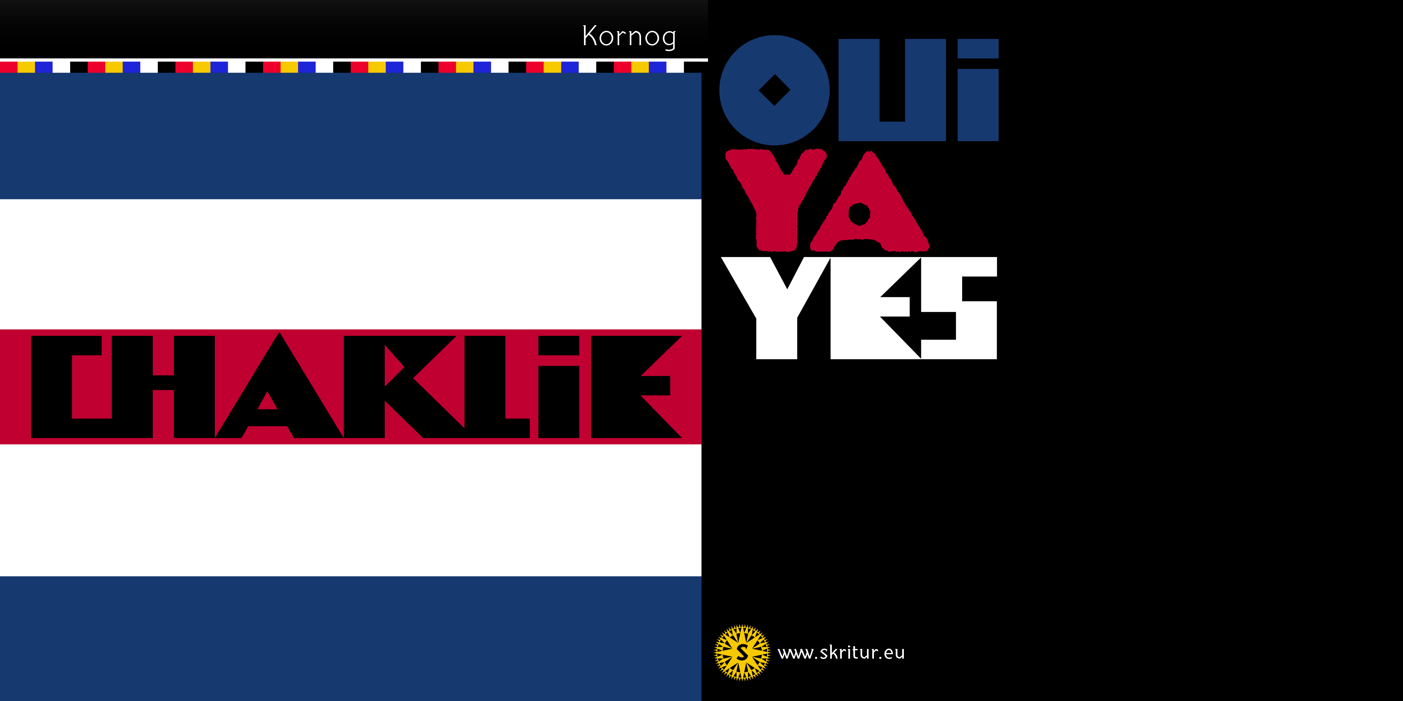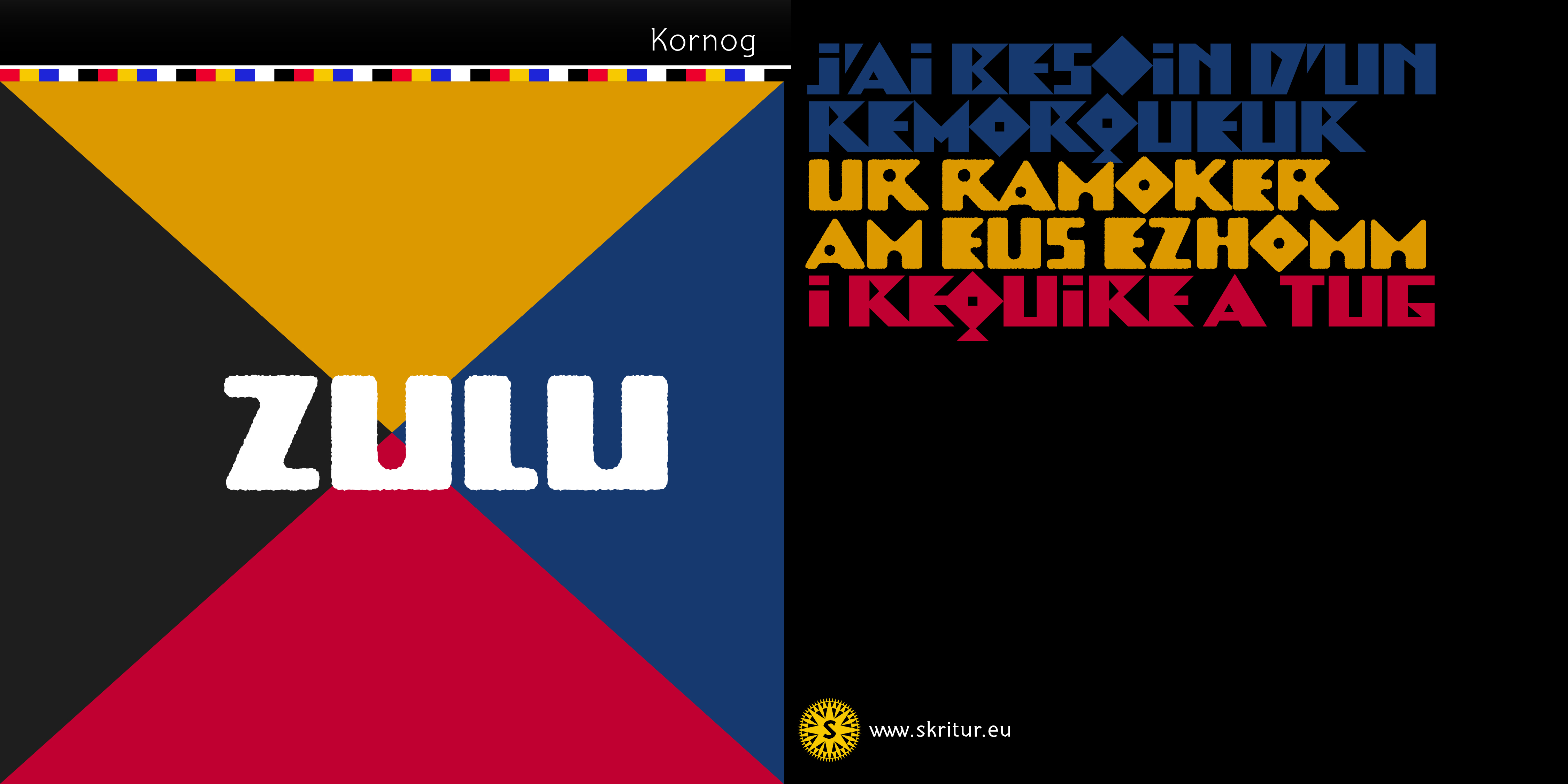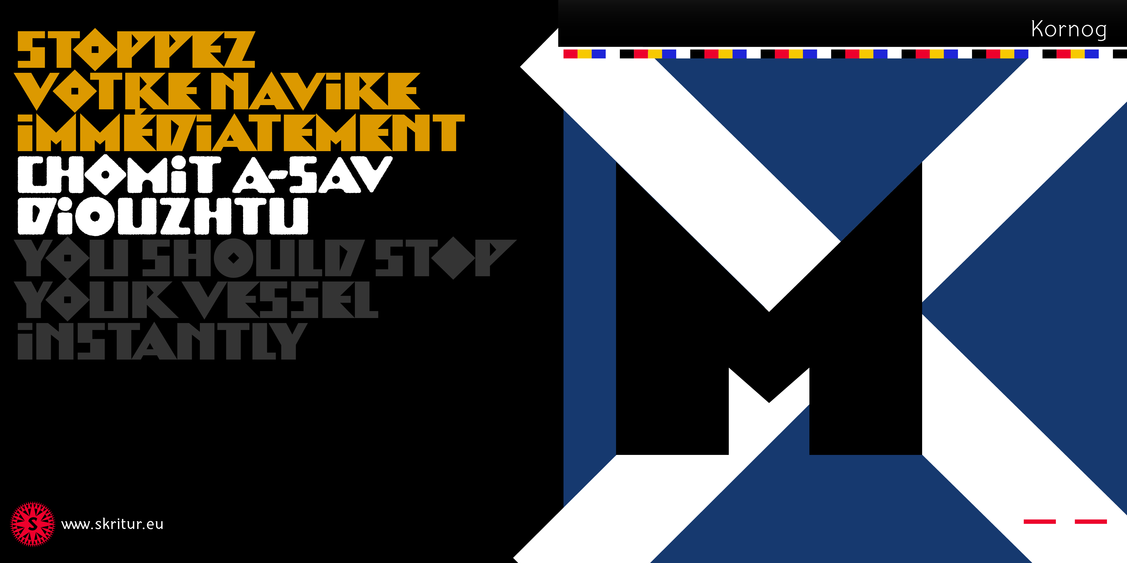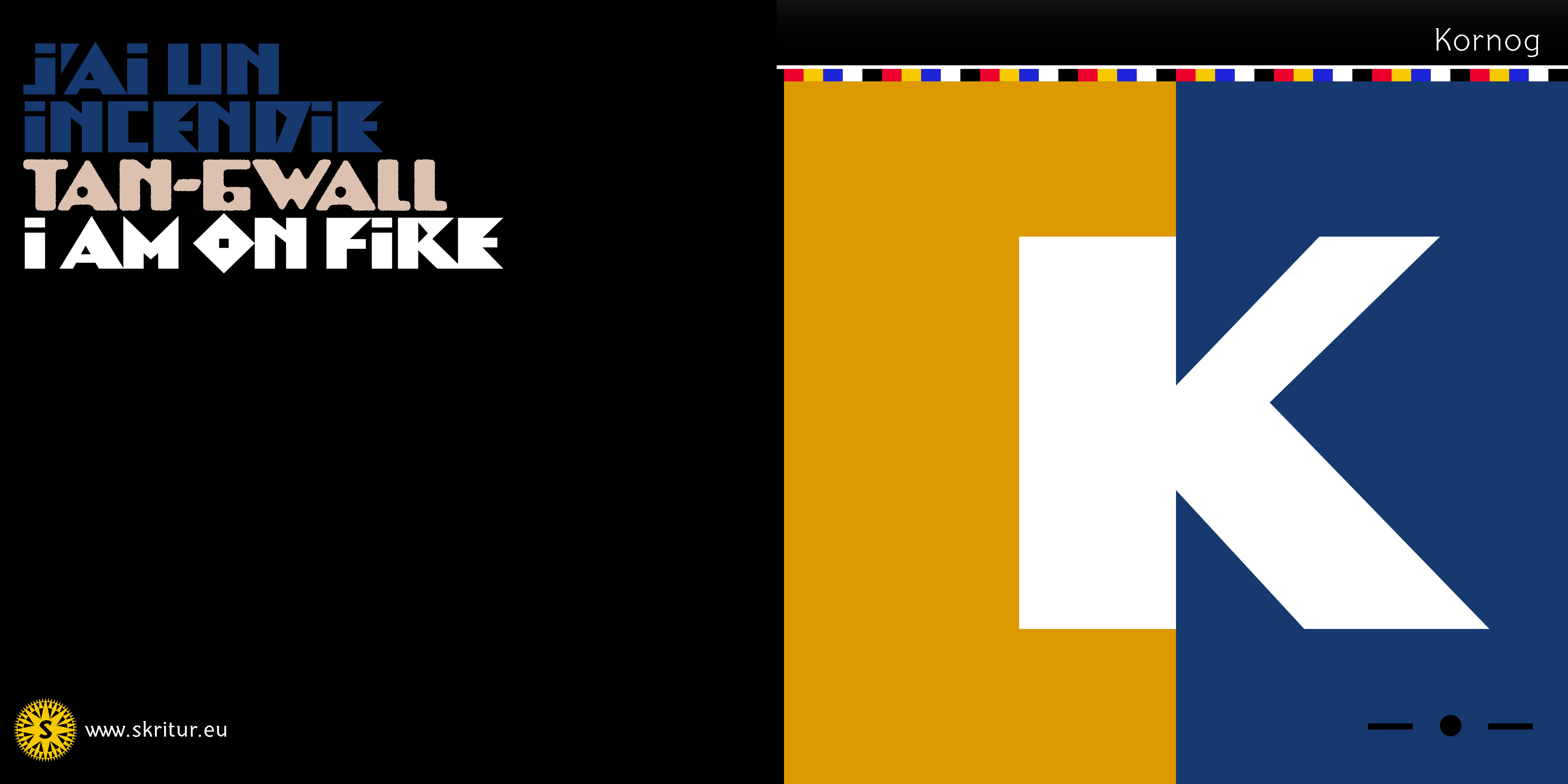 En 1995, lors de la publication de son ouvrage Skritur – typographie & identité, le graphiste Fañch Le Henaff présentait un premier alphabet dessiné à partir de la têtière de la revue, gravée sur bois par René-Yves Creston et Suzanne Candré-Creston, tous deux cofondateurs du collectif, avec Jeanne Malivel et Jorj Robin. Pour célébrer le centenaire du mouvement, le caractère Kornog est aujourd’hui revu et augmenté afin d’en permettre un usage pour le titrage (presse, affiche, édition…) qui n’a rien à envier à la radicalité formelle prônée par ces artistes de l’Art déco breton : géométrique, acéré et puissant. Une version «print» donne au Kornog une saveur rétro où l’on assume les imperfections de l’impression des caractères bois et l’encrage fluctuant d’un tirage à l’autre.