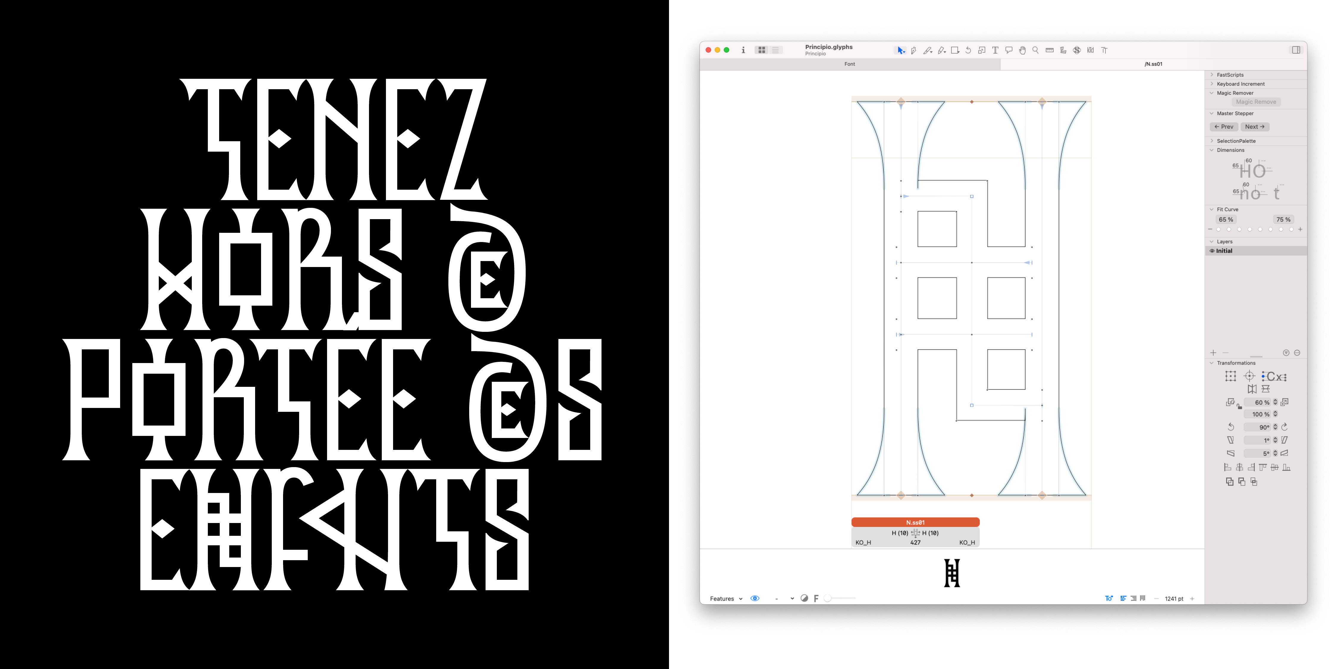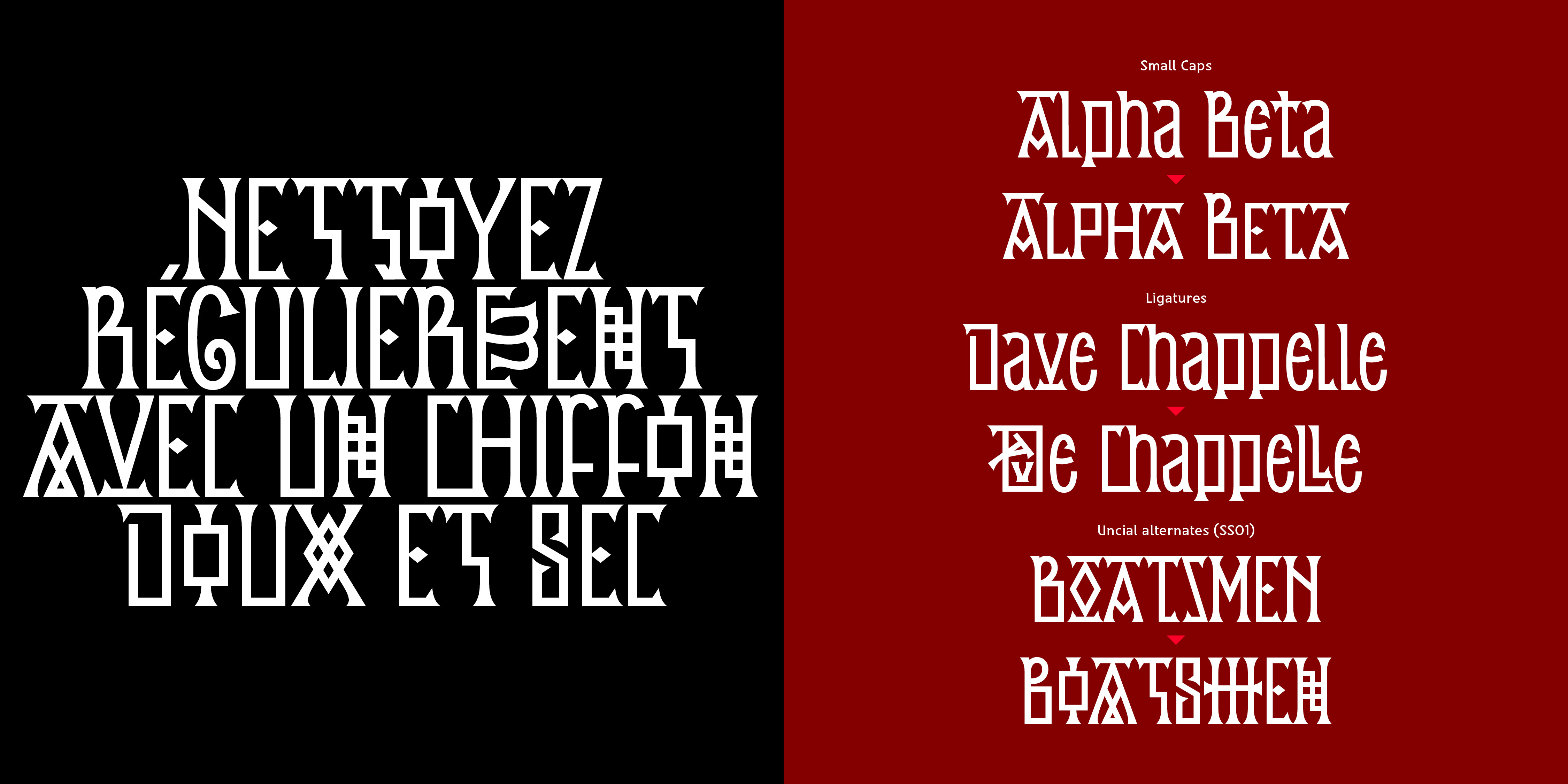 Principio is a free typographic interpretation of the capitals found on the title pages of illuminated Irish and English manuscripts dating back to the 7th century. These typographic compositions, with their interwoven and ornate characters, are of breathtaking graphic richness. Among the most beautiful manuscripts that have come down to us are the Book of Durrow (664–700), the Lindisfarne Gospels (700), and the Book of Kells (Iona and Kells, 800). Principio seeks to capture the spirit of early medieval art through a geometric interpretation adapted for contemporary use. Capitals, lowercase, and small caps can be used separately or combined to create a wide variety of tones and styles. The typeface also includes an extensive set of intricate ligatures and uncial alternates, offering a rich diversity of forms to explore.
